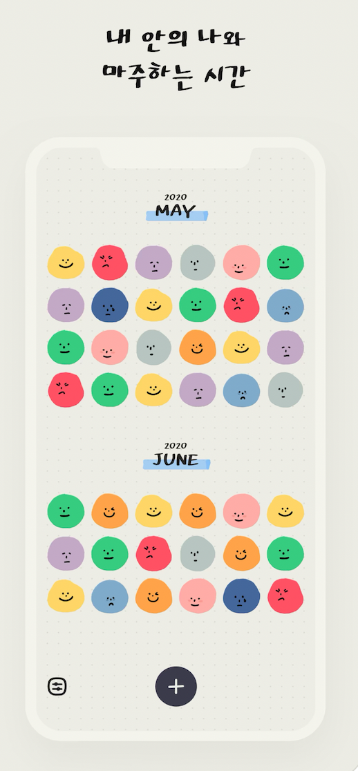 또 무드 트래커 방식의 기록의 강점은 쉽고 직관적이라는 점이에요. 우리가 일기를 쓰다보면 너무 잘 쓰려고 하거나 길어지면서 버거울 때가 있는데요. ‘표정’이라는 직관적인 도구를 중심으로 그날의 감정을 표현할 수 있다는 게 기록을 꾸준히 해나가는 동기가 됩니다. 이렇게 모인 감정 표정들은 월 단위로 모아서 볼 수 있기 때문에, 내가 어떨 때 어떤 기분을 느꼈는지 어떤 감정을 주로 느끼는지를 살펴볼 수 있어요.