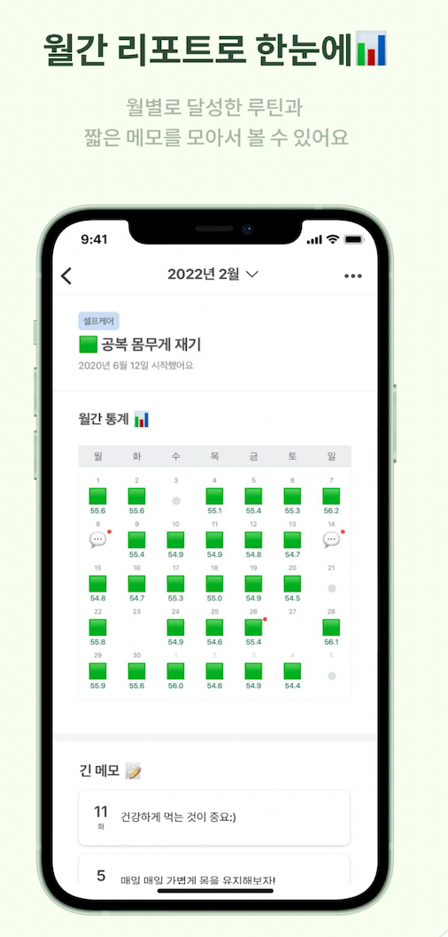 이렇게 체크된 기록을 바탕으로 하루 단위나, 주/월 단위로도 내가 얼마나 루틴을 잘 실행해왔는지 보여주기 때문에 손쉽게 일상을 돌아보고 점검해나가는 것이 가능해요. 마이루틴을 통해서 루틴화하고 싶은 소소한 습관들을 적어두고 매일 체크하는 방식은, 살다보면 어느 순간 잊어버리거나 귀찮아지는 사소한 좋은 습관들을 만드는 일에 큰 동기부여가 되죠!