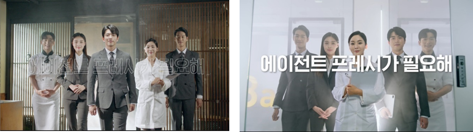 저희는 CJ프레시웨이를 실체화로 표현하여 저희가 해야 하는 이야기를 영상 안에서 풀어내고자 했어요. 실체화는 에이전트프레시와 CJ프레시웨이로 동일시하여, 고객들이 보다 쉽게 CJ프레시웨이를 이해하고 더욱더 친근하게 다가갈 수 있는 방법으로 고안해낸 것이였죠. 이번 브랜드 필름의 키 메시지는 데이터를 기반으로 맞춤 솔루션과 다양한 콘텐츠를 제공하는 역할을 하는 에이전트 프레시가 고객의 니즈가 있는 곳이면 어디에서나 고객의 니즈를 채워준다는 것이었어요.