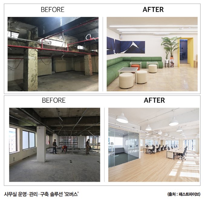 모버스는 이미 사무실이나 건물을 가지고 있는데, 공간만 패스트파이브처럼 꾸미고 싶거나, 직원들에게 제공하는 편의만 패스트파이브처럼 운영하고 싶은 분들을 위한 사무실 운영·관리·구축 솔루션입니다. 때로는 매물을 찾는 것부터 시작하기도 합니다. 또 인테리어가 완료된 사무실은 운영·관리 서비스만 받을 수도 있어요. 사무공간과 회사를 운영하는 데 필요한 청소, 소모품 관리, F&B 관리 등 원하는 서비스만 골라서 이용하는 ‘모버스 멤버십’이라는 상품이죠. 즉 사무공간을 만들고 유지하는 것에 있어 고객이 필요한 단계의 서비스만 선택해서 모버스라는 전문가에게 맡기는 솔루션이라고 생각하면 됩니다.