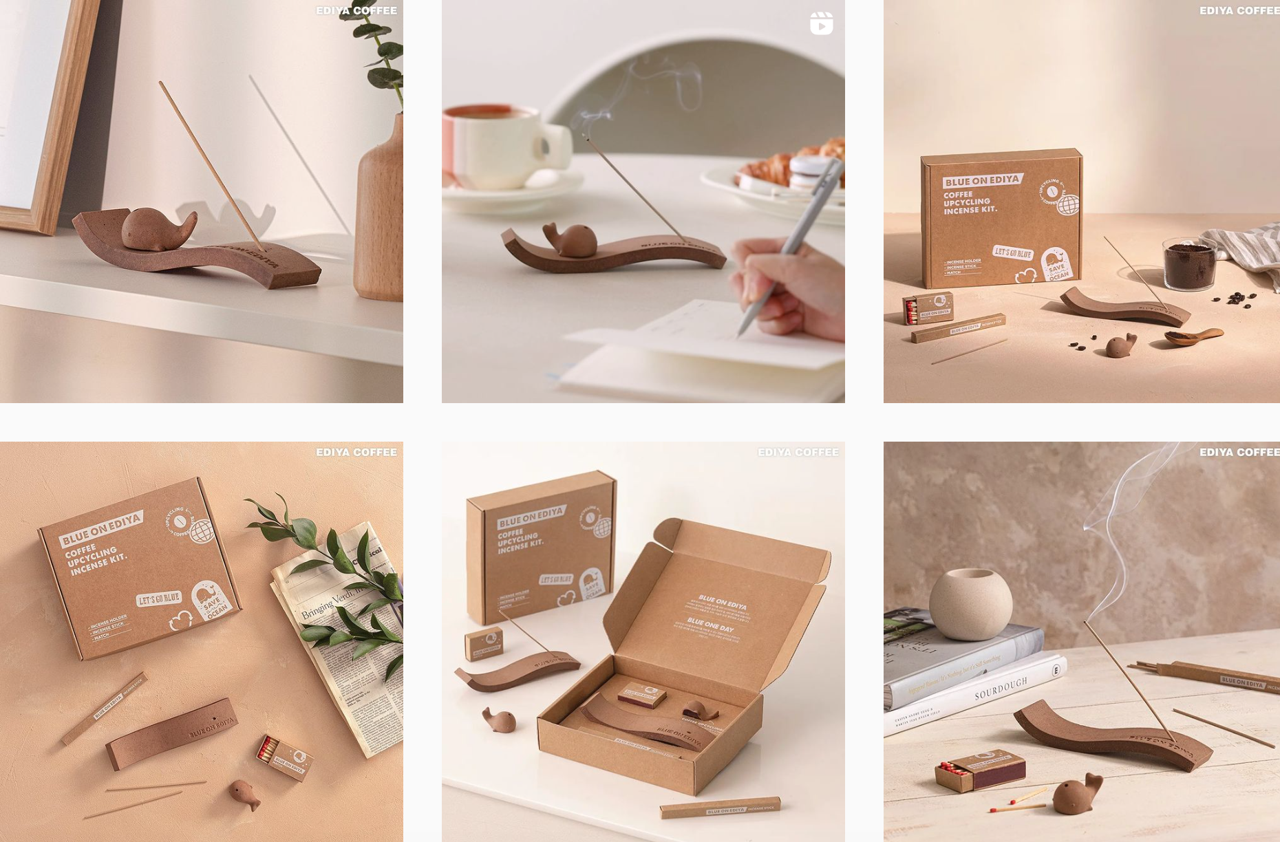 이디야는 최근 인스타그램을 통해서 편안해 보이는 우드톤 컬러와 LP모양 스피커와 인센스 홀더 세트 등 요즘 유행하고 있는 아이템들을 잘 매치한 굿즈들로 마케팅을 하고 있습니다. 이런 아이템들은 사람들이 좋아할 만한 굿즈일뿐더러, 모두 휴식과 관계된 제품들이죠. 이러한 이미지들의 통일감을 통해서 이디야라는 커피 전문점이 추구하는 정체성을 보여주고 있어요.