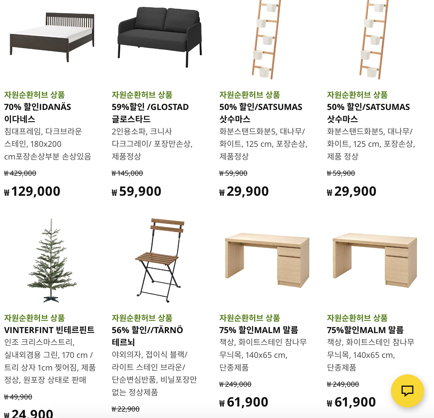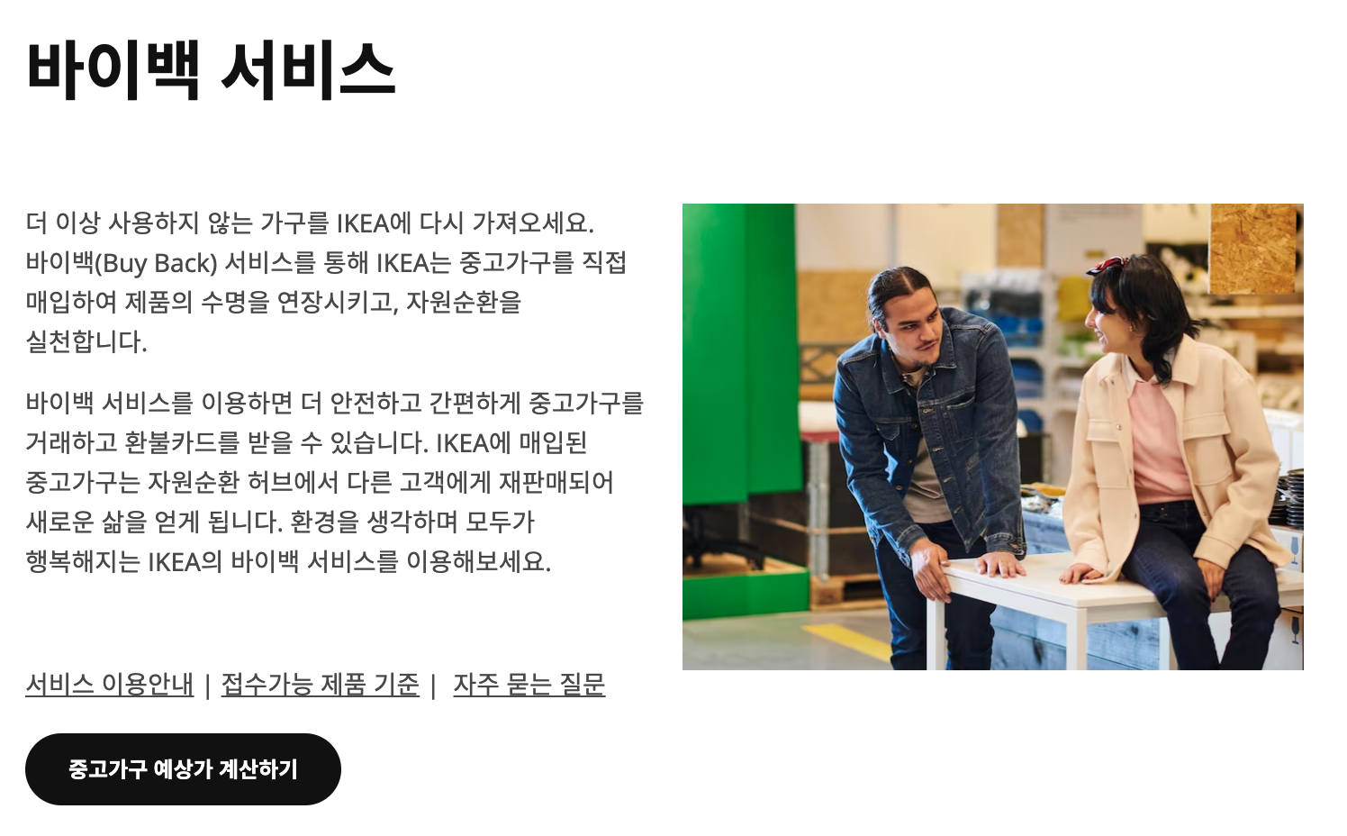 이케아는 전국 매장에서 바이백 서비스를 실시하고 있는데요. 더이상 사용하지 않는 이케아 가구를 매장으로 가져오면, 이케아가 중고가구를 직접 매입해서 다른 고객에게 재판매를 하는 프로그램입니다. 버려질 가구를 이케아가 직접 구입해 보증하고, 자원순환을 위해 노력한다는 취지인데요. 고객들은 '자원순환 허브' 홈페이지를 통해서 지점별로 어떤 중고 상품들이 있는지 확인할 수도 있어요. 이 홈페이지를 살펴보면 기존 이케아 제품의 가격에 비해 반값보다 저렴한 가구들이 많은 데다가 단종 제품을 구할 수도 있어요. 지점을 직접 방문 안 해도 온라인으로 배송을 받을 수도 있어서 필요한 가구를 발견했다면 쉽게 득템이 가능한 구조라고 할 수 있죠!