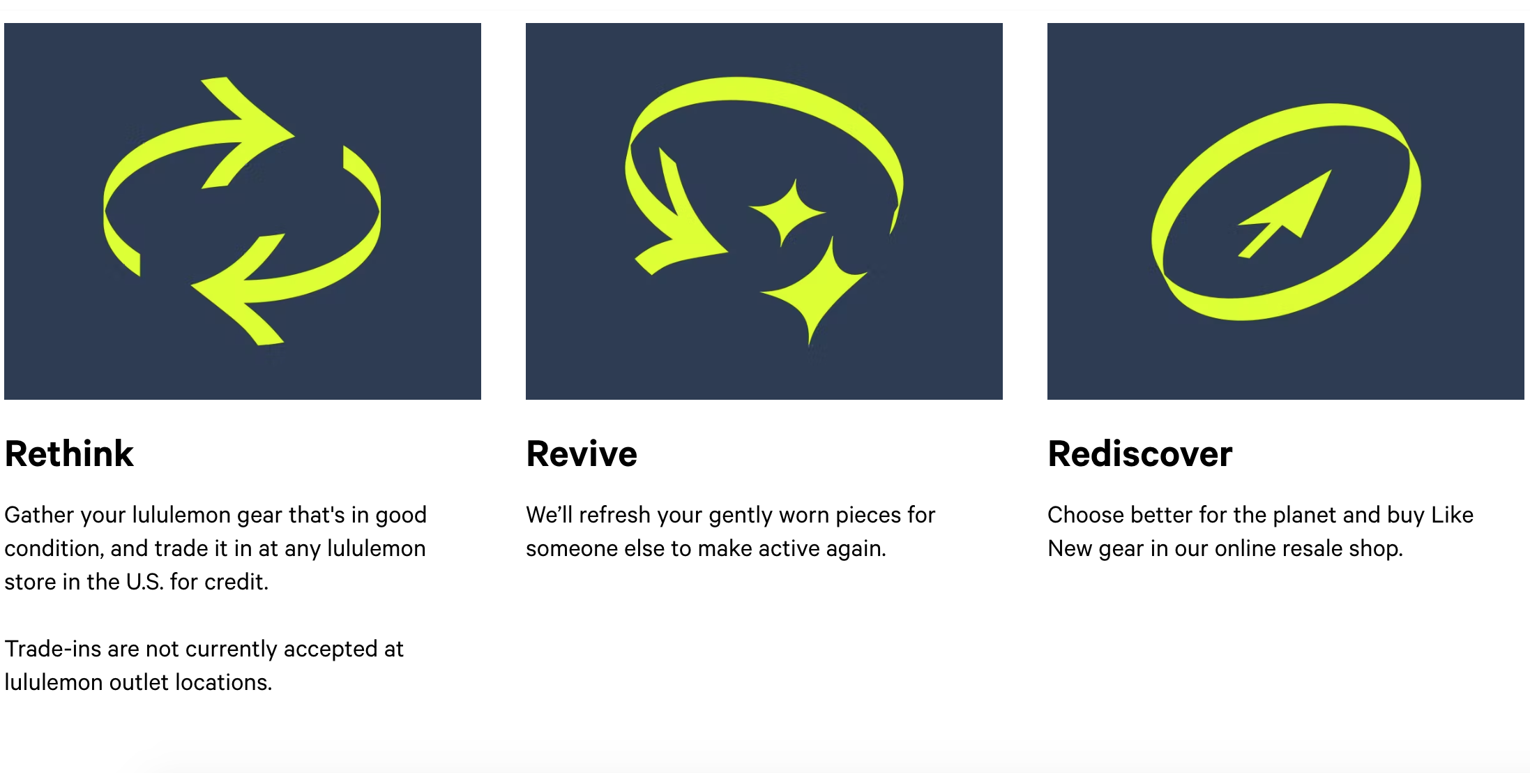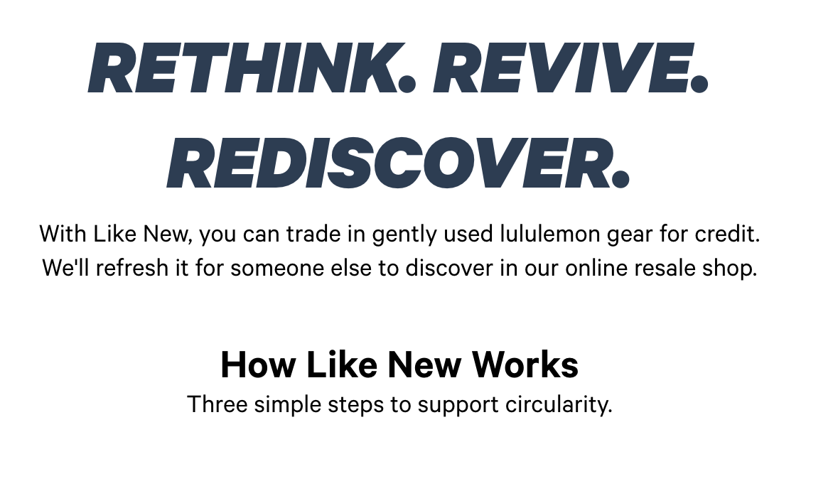 룰루레몬은 지구의 날이기도 한 올해 4/22부터 라이크뉴(Like New)라는 리커머스 프로그램을 만들었어요. 룰루레몬의 Like New 프로그램은 “다시 생각하고, 되살리고, 재발견하라”라는 슬로건을 가지고 있다고 해요. 이 프로그램을 통해서 룰루레몬 제품을 가지고 있는 고객은 쓰던 중고 제품을 매장에서 기프트카드로 바꿀 수 있는데요. 혹은 새 제품을 구매할 때 가격 할인을 통해서 보상을 받을 수도 있어요.
