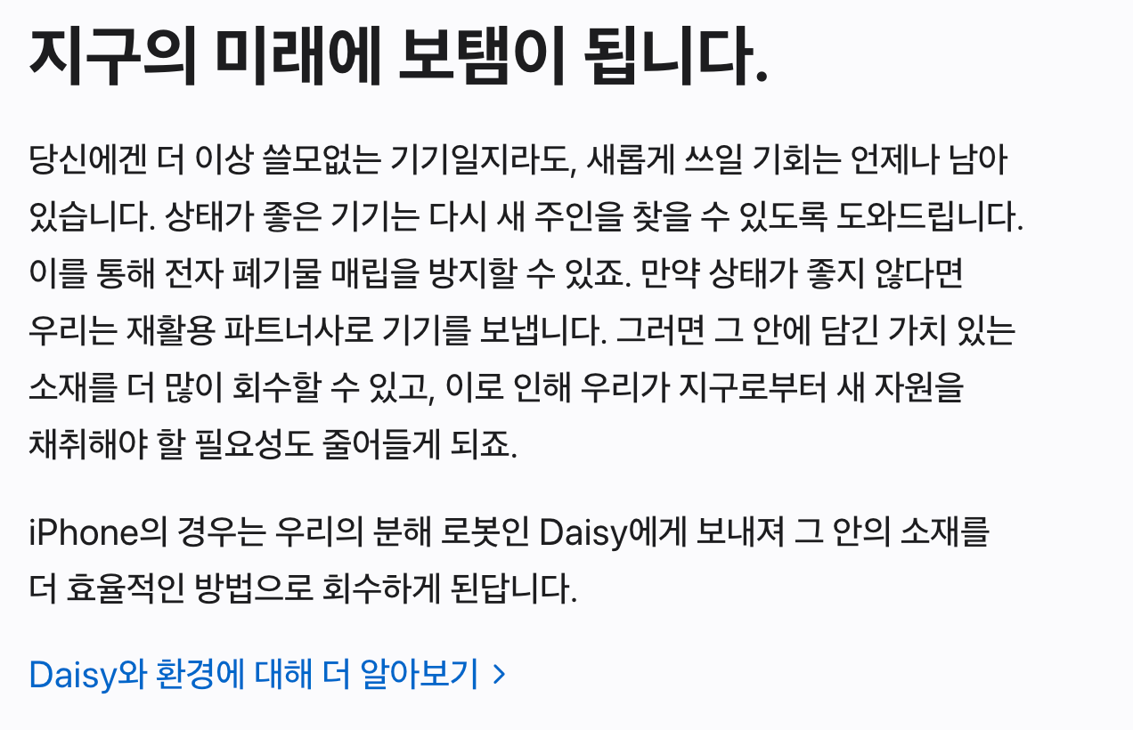 마찬가지로 애플도 보상판매라는 형태의 프로그램을 운영하고 있는데요. 고객들은 쓰던 제품을 애플에게 다시 판매해서 새 제품을 사기 위한 크레딧을 받을 수도 있고, 아예 현금으로 판매금을 받을 수도 있어요. 이렇게 애플이 구매한 중고 제품들은 점검을 거쳐서 중고 상품으로 다시 고객들에게 판매됩니다. 이렇게 보상판매 정책을 운영하면서 애플이 강조하는 것 역시 '자원 순환'인데요. 이러한 프로그램을 통해서 친환경에 대한 고객들의 고민을 자체 브랜드 안에서 해결하고, 결과적으로 ESG 경영에도 전략적으로 도움이 되는 것이죠.