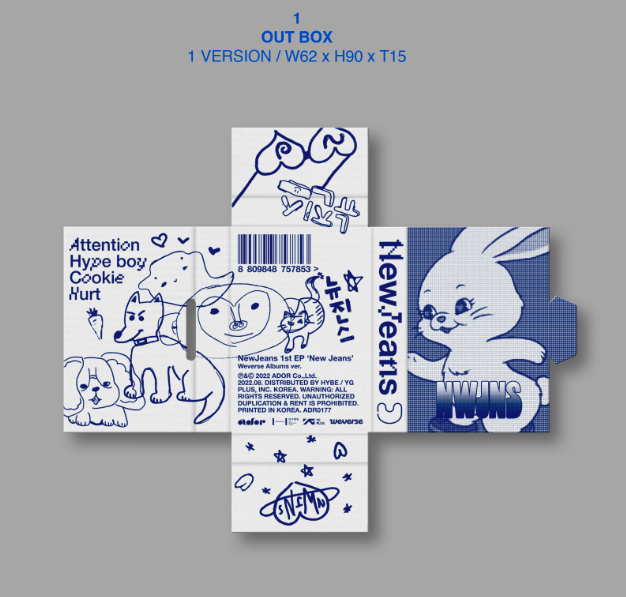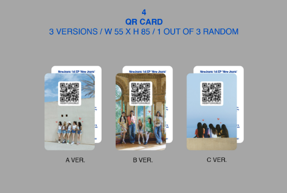 위버스 앨범은 포토카드 사이즈의 작은 앨범으로 구성되어있는데요. 이 앨범을 구매하면, CD는 들어있지 않고 포토카드 등의 굿즈와 QR카드가 들어있어요. 이 QR카드를 통해서 음악을 들을 수 있는 건데요. 위버스 어플을 다운받으면, 어플에 QR을 등록해서 앨범을 다운로드할 수 있는 방식이죠. 뉴진스 앨범도 마찬가지로 위버스 앨범 버전이 나왔어요. 실물로는 앨범이 정말 작아서, 깜짝 놀란 팬들도 많았다고 해요. 굿즈 맛집 답게 CD는 없더라도 구성이 다양했는데요. 가사집부터 포토카드, 그리고 QR카드가 담겨 있었어요.