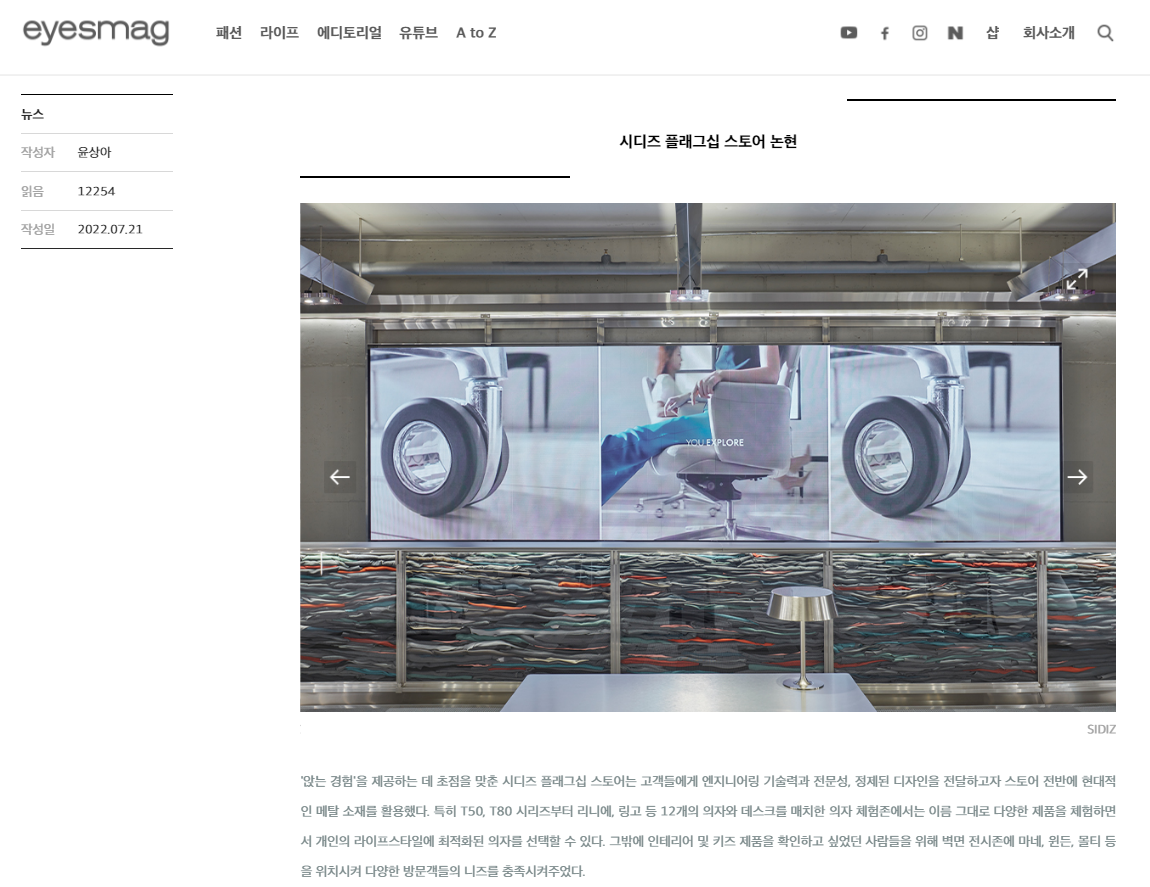 이벤트 소개, 이미지 다수 추가 등 상세 리뷰가 가능한 기획 기사를 통해 웹 및 아이즈매거진의 SNS에 게재를 진행했고, 트렌드와 소비가치에 민감한 2030 유저들에게 일반 의자 매장이 아닌 시디즈만의 브랜드 철학을 담은 플래그십 스토어 논현 오픈 소식 안내하며 브랜드 인지도 제고에 집중했죠.
