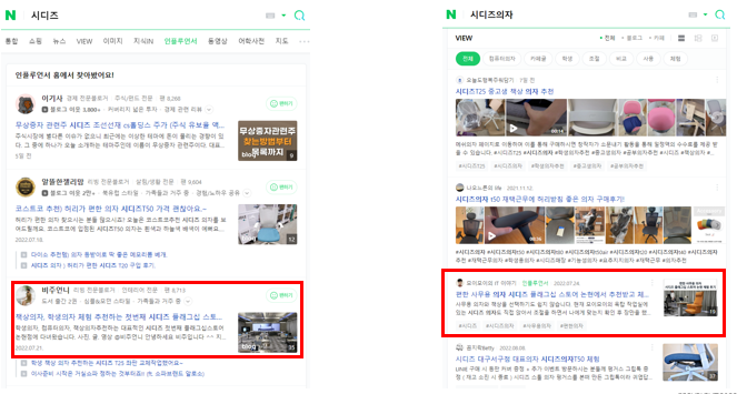 또한, 시디즈, 의자 추천, 의자 매장 등의 포털사이트 내 키워드 상위 노출과 DB 축적과 유저들의 관심과 반응을 이끌기 위한 인플루언서 방문 리뷰 포스팅을 진행했어요.