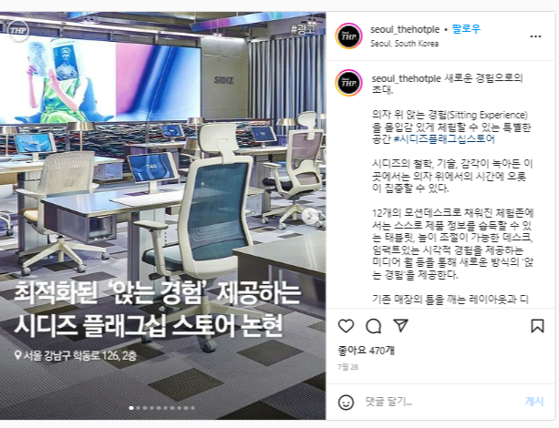 이벤트 소개, 이미지 다수 추가 등 상세 리뷰가 가능한 기획 기사를 통해 웹 및 아이즈매거진의 SNS에 게재를 진행했고, 트렌드와 소비가치에 민감한 2030 유저들에게 일반 의자 매장이 아닌 시디즈만의 브랜드 철학을 담은 플래그십 스토어 논현 오픈 소식 안내하며 브랜드 인지도 제고에 집중했죠.