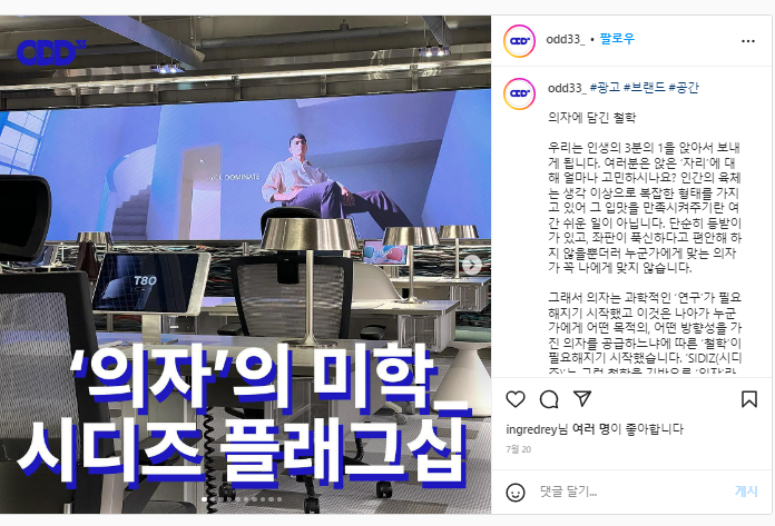 시디즈가 고객에게 전달하고자 하는 브랜드의 철학과 '유현준' 교수님의 기존 이미지와의 시너지가 좋았다고 생각해요. 타겟들이 느끼기에 광고성이 짙지 않아 거부감이 들지 않았던 브랜디드 영상 제작과 커뮤니티 바이럴이 다양한 플랫폼에서 시디즈 플래그십 스토어 논현 오픈 소식 확산 및 방문 유도가 우호적인 바이럴로 발생될 수 있던 이유라고 보고 있어요.