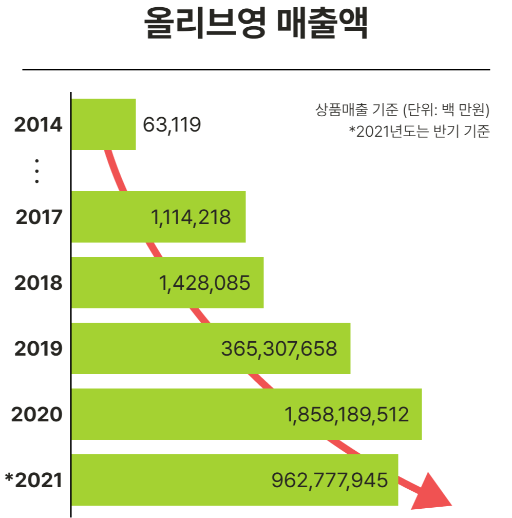 옴니채널 전략 이후 올리브영이 어떻게 변화했을까요? 올리브영의 매출액은 2014년 이후 지속적으로 상승하고 있음을 확인할 수 있어요. 2014년 상품 매출이 약 631억 원이었으나, 2021년 반기 상품 매출로 9,627억 원을 달성했거든요.