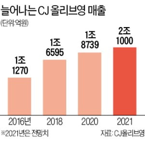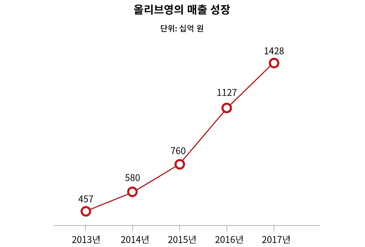 CJ올리브영은 1999년 신사 1호점을 시작으로 2017년에 전국 매장 1,000개 이상을 내놓았어요. 이들은 부동의 헬스&뷰티(H&B) 시장 점유율 1위이자, 국내 최초 H&B 사업에 진출한 회사랍니다.