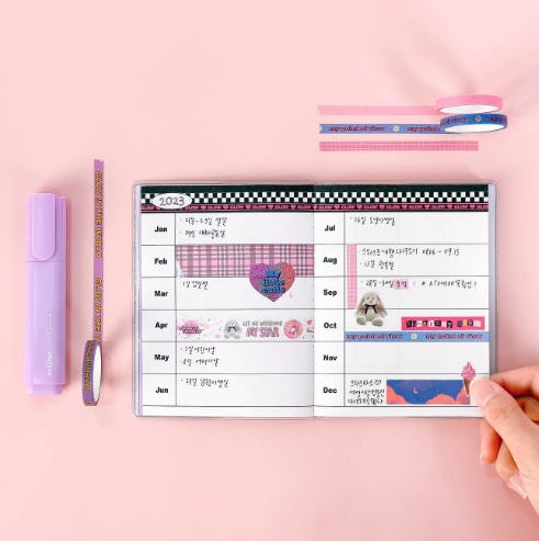 먼저 (가장 왼쪽 사진의) 하이틴 반짝이 키링과 비즈스트랩 키링은 소지품에 명랑한 포인트를 줄 수 있도록 디자인했어요. 함께 출시한 6공 다이어리에 장식하면 <금발이 너무해>의 주인공 엘이 들고 다니는 듯한 느낌을 자아낼 수 있어요. 이러한 제품 디자인은 결과적으로 하이틴 제품을 즐겨 쓰는 1020 세대의 취향을 적극적으로 대입해서 만들었다고 볼 수 있어요. 또 이 세대는 완제품을 사서 만족하기보다, 자신이 직접 취향에 맞게 꾸미는 과정을 좋아하기 때문에 '다꾸'를 위한 다양한 마스킹 테이프도 함께 판매한다는 포인트도 눈 여겨 볼 만합니다. A제품에 따른 파생 상품으로 B 제품을 만든 것이니까요.