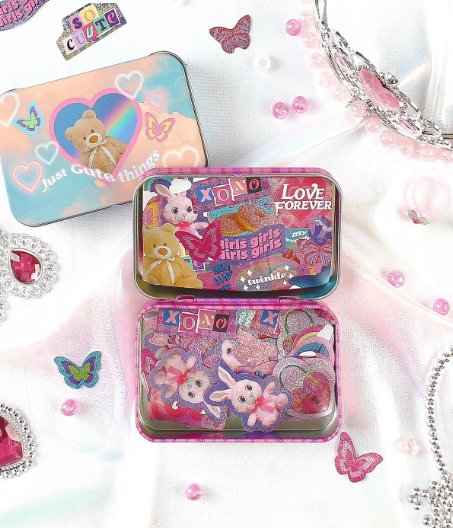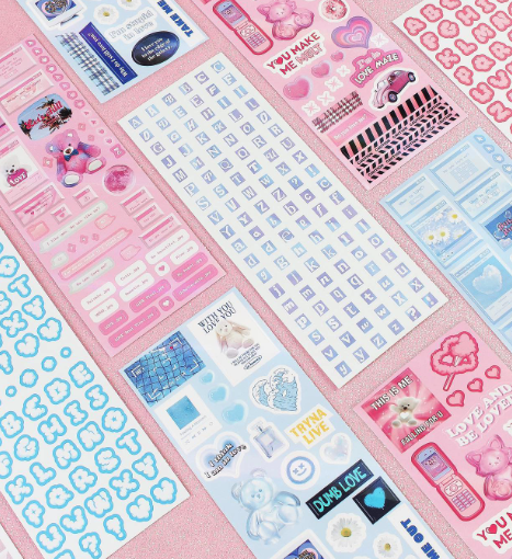 또 한 가지 눈 여겨 볼 점이 있어요. 바로 스티커입니다. 마스킹 테이프에 이어 알록달록하고 다양한 스티커를 하이틴 무드로 만들었어요. 다꾸라는 중심 주제를 한 번 잡으니, 키링, 떡메, 마스킹 테이프, 스티커, 스티커를 담아 보관할 틴케이스까지 파생 상품을 자연스럽게 내어놓을 수 있다는 점이 가장 인상 깊어요. 하이틴이라는 주제도 물론 트렌드에 잘 맞아떨어졌지만 그 이미지를 상품으로 기획하는 과정도 굉장히 섬세하네요!