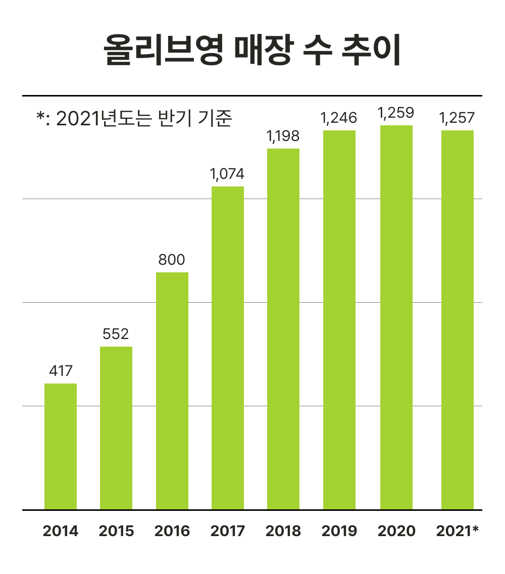 국내에서는 올리브영이 1,200개가 넘는 직영 매장을 운영 중이지만, 해외에서는 아직 고전 중이에요. 해외 시장 진출의 포문을 연 2016년, 2017년에는 해외 매장을 200개나 열었었지만, 2018년엔 117개, 2019년에는 48개로 출범 속도가 점차 더뎌졌거든요. 코로나 19가 직격탄을 날린 20년과 21년에는 각각 12개와 7개까지밖에 내지 못했어요.