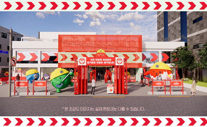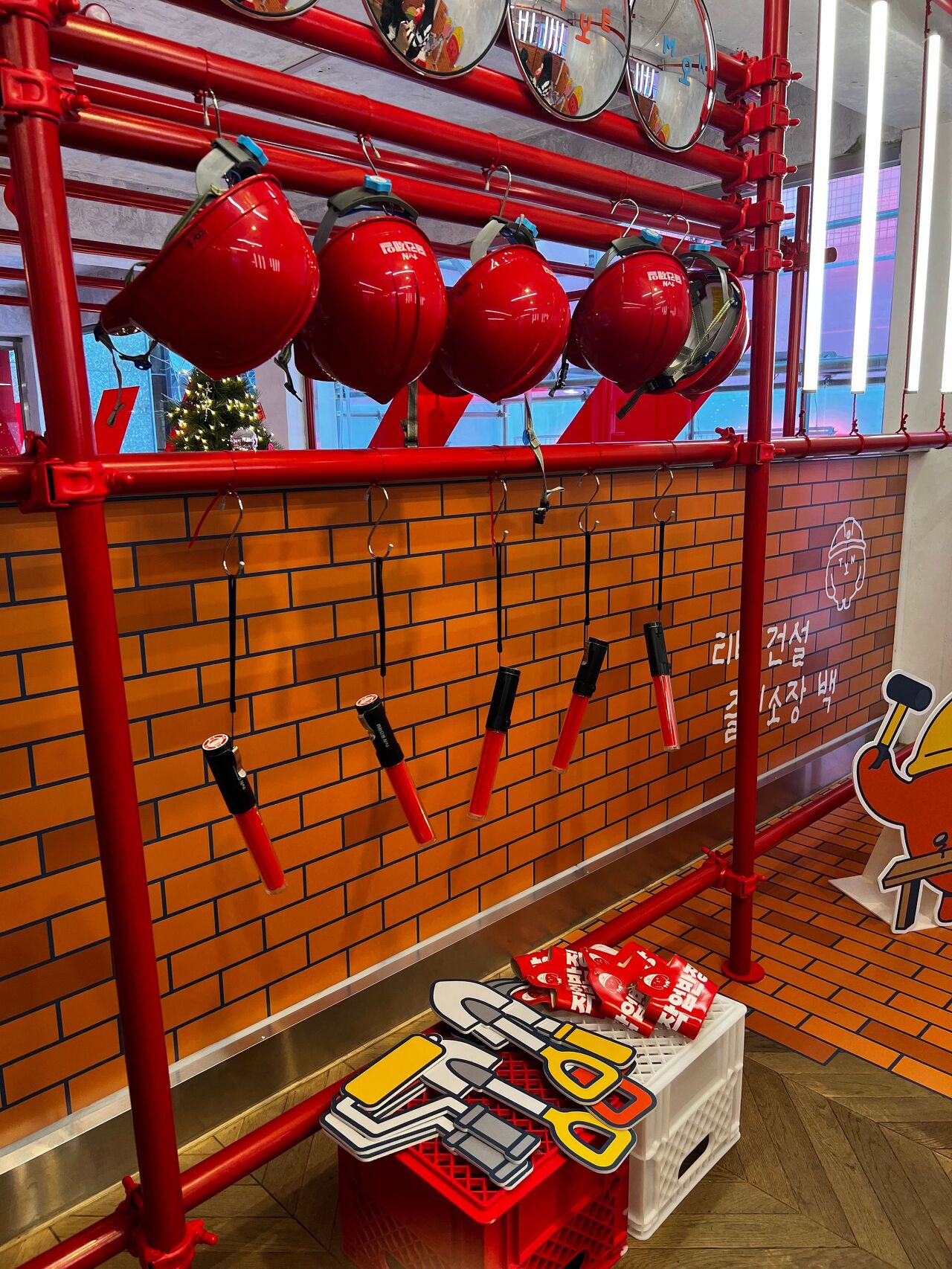 다음은 즐거움 재건 포토존이과 tvN 재건 현장이에요. 포토존은 이제 Z세대들에게 빼놓으래야 빼놓을 수 없는 필수코스죠! 안전모, 경광봉 등 공사장 콘셉트에 맞는 다양한 소품이 준비되어 있었어요. 귀여우면서도 콘셉트에 충실한 소품들이 tvN이 얼마나 공을 들였는지 보여요.