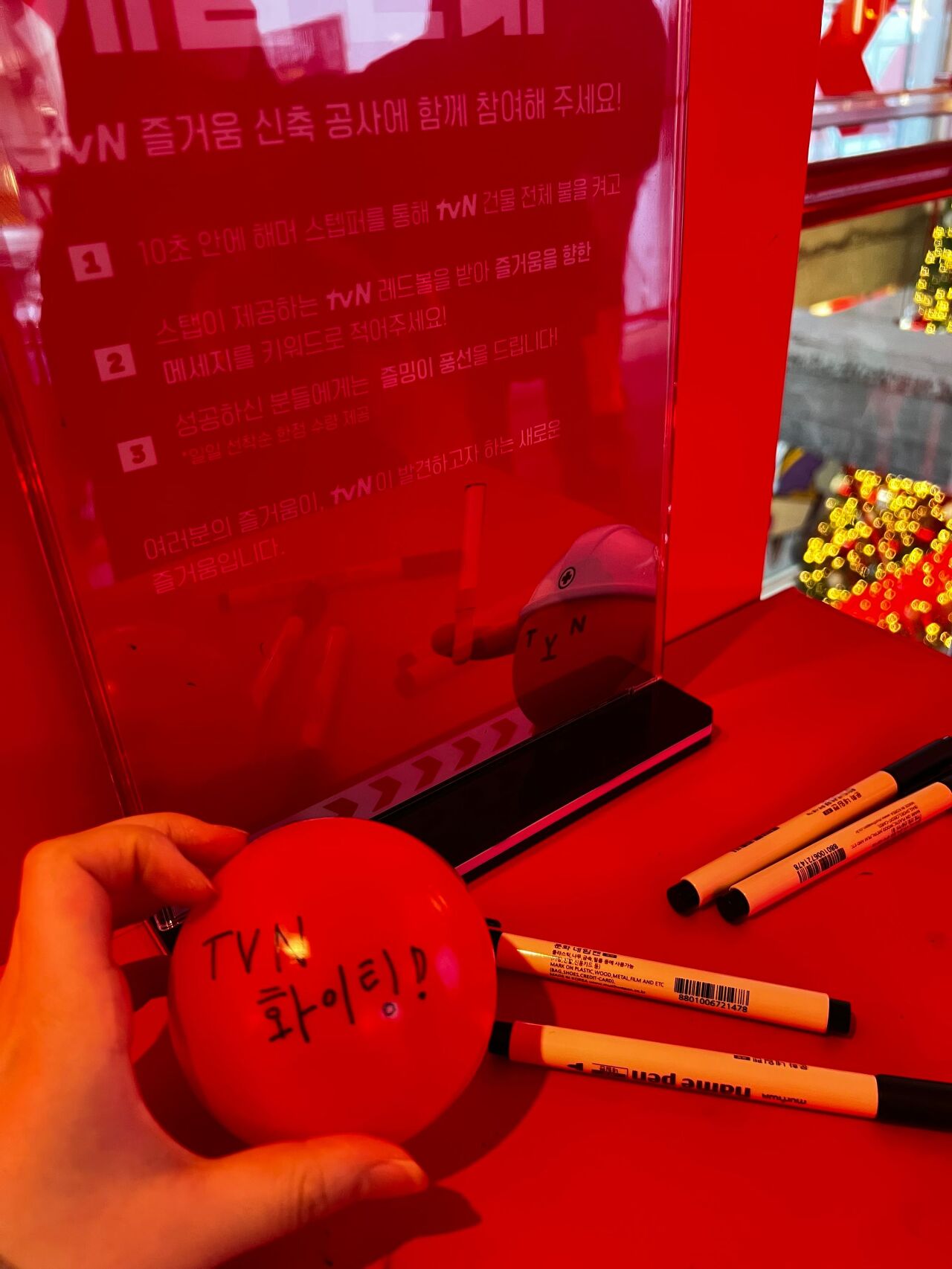 tvN 재건 현장은 망치로 두드리면 건물의 불빛이 나기 시작하고 끝까지 불을 채우고 나면 빨간 공을 받아요. 공에는 tvN을 향한 메시지를 써서 담을 수 있게 구성이 되어있어요. 소소하지만 이런 체험들이 결국 기억에 남는 것 같아요. tvN 재건에 함께하는 느낌이 들어서 좋았어요.