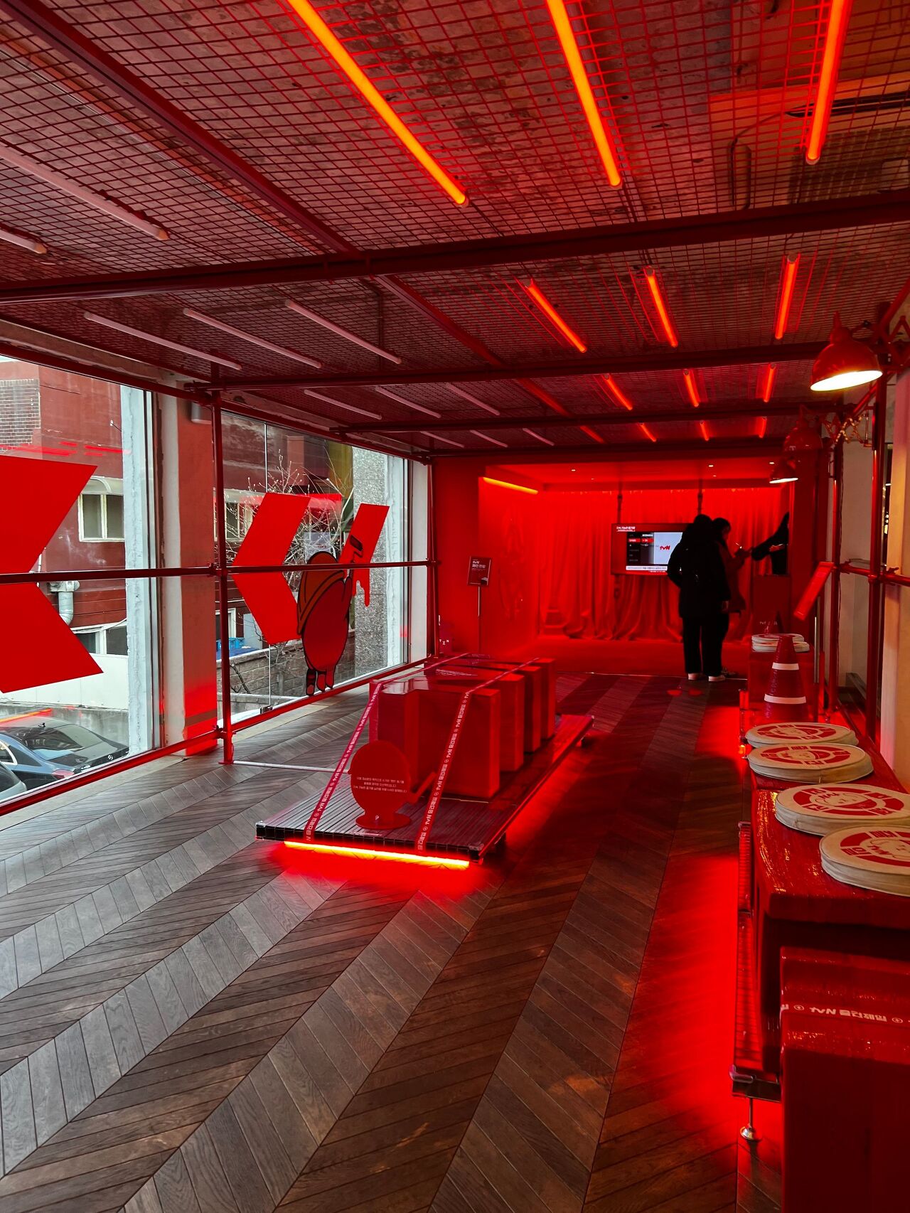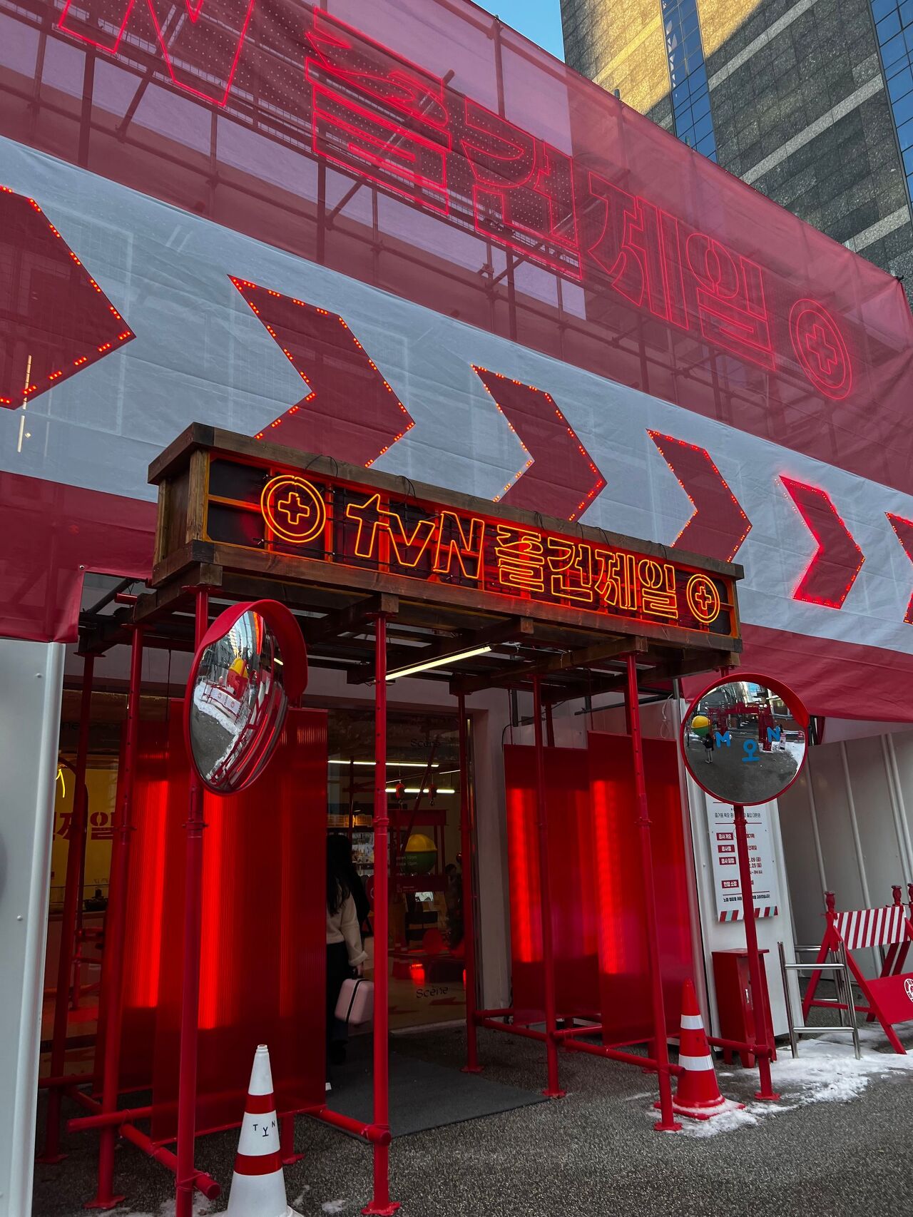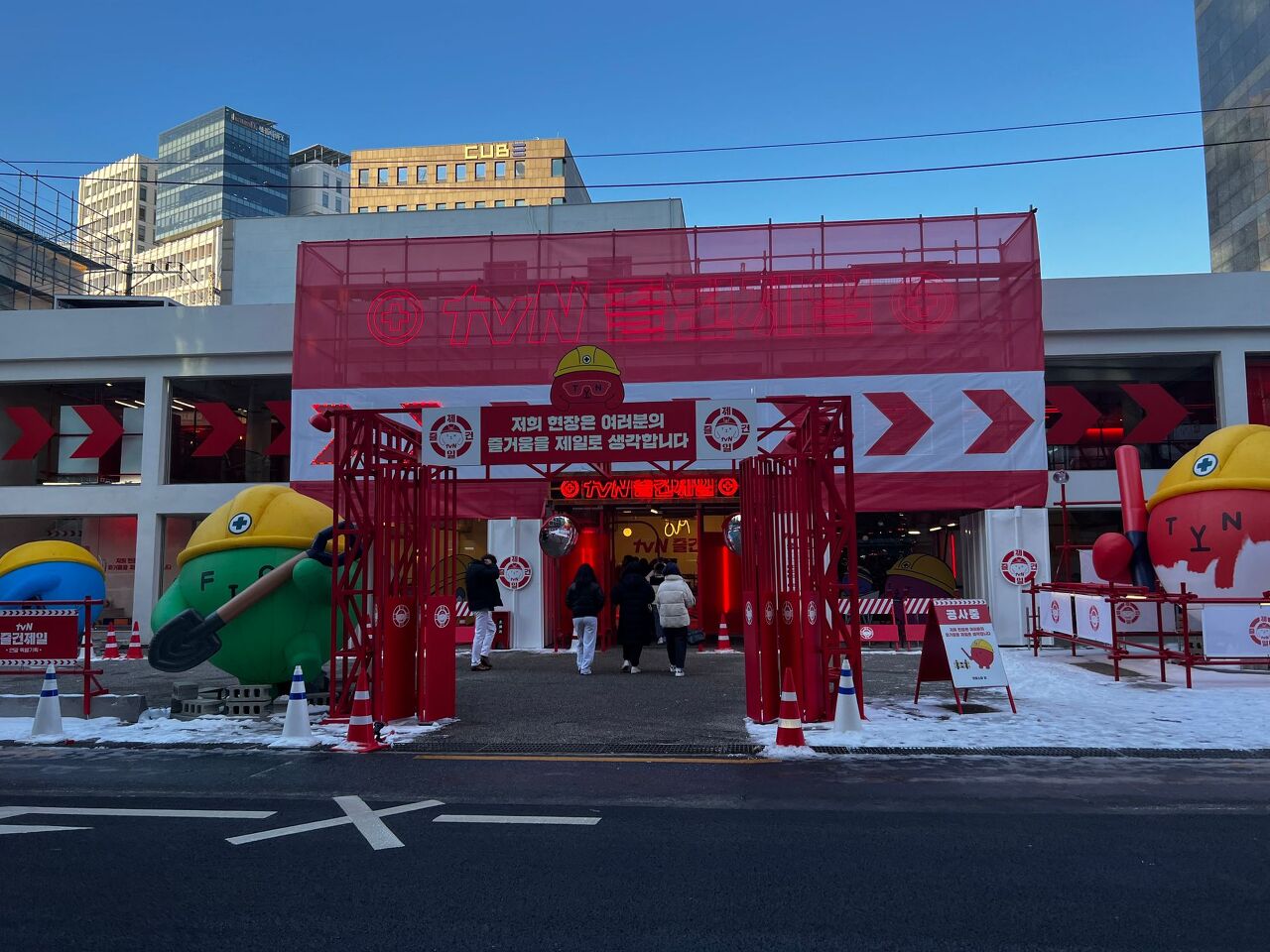 입구부터 공사현장의 콘셉트를 굉장히 잘 살렸어요. 실제로 공사현장에 온 것만 같은 느낌을 제대로 받았어요. 마치 저도 안전모를 써야 할 것만 같은 기분이에요. ‘공사현장’이라는 콘셉트에 tvN의 로고 컬러를 잘 녹여내었고, 연말 분위기에도 어울리는 색감이었어요.