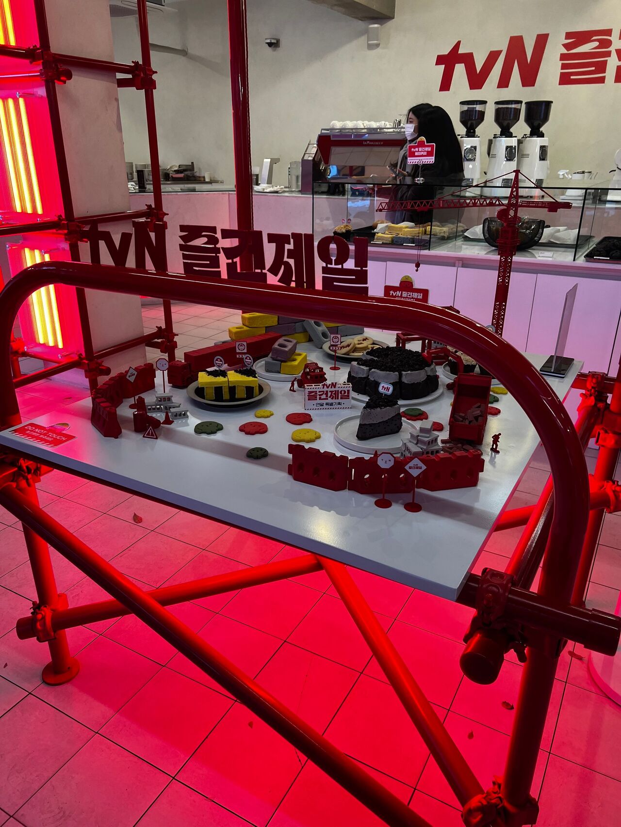 1층에 들어가고 나면 눈을 사로잡는 건 신기한 모양의 케이크들이에요. 벽돌 케이크, 시멘트 케이크, 방지턱 케이크 등 콘셉트에 정말 충실했구나 하고 디테일이 느껴지는 케이크들이에요. f&b 뿐만 아니라 디테일하게 꾸며진 각종 소품들도 tvN이 이번 팝업에 얼마나 진심이었는지 보여주고 있어요. 음료 메뉴명 역시 센스가 보여요. 프로그램명과 메뉴명을 적절히 섞어서 눈과 입이 즐거운 시간이었어요.