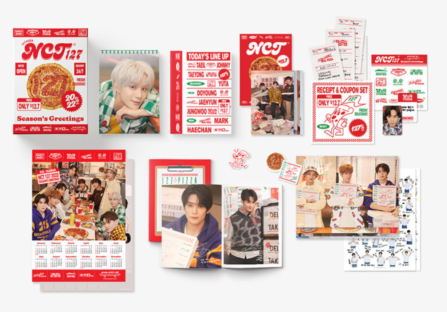 2022년에 NCT는 피자가게 컨셉으로 시즌그리팅을 출시해서 주목을 받았어요. 멤버들도 피자가게 컨셉으로 사진을 찍었고, 영수증이랑 쿠폰, 전단지까지 구성에 담았어요. 일반적인 시즌그리팅과 달리 독특한 컨셉이 패키지 전체에 잘 녹아있어서 NCT 팬뿐만 아니라 케이팝 팬들에게 좋은 평가를 받았어요.