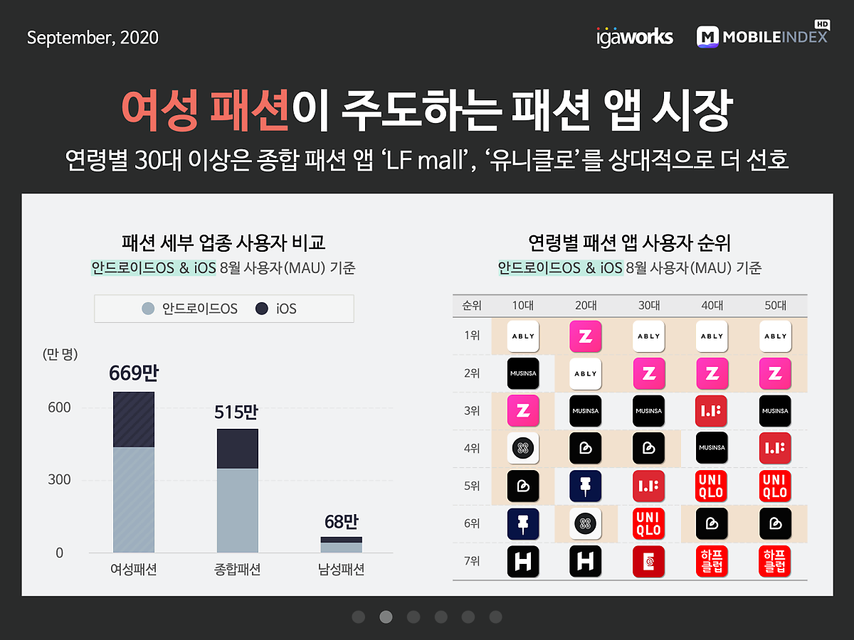 3년 만에 업계 1위라고 불리는 에이블리, ‘AI 개인화 추천 알고리즘’으로 업계 스타로 떠올라 고공행진, 1위를 달리고 있는데요. 아이지에이웍스의 모바일 인덱스에서 제공하는 정보에 따르면 작년 8월 통계 기준, 연령별 패션 앱 사용자 순위 1위를 차지했어요. 10대부터 50대까지 모두 에이블리에 열광하고 있다는 뜻! 다양한 연령을 열광하게 만든 에이블리만의 전략을 살펴볼까요?