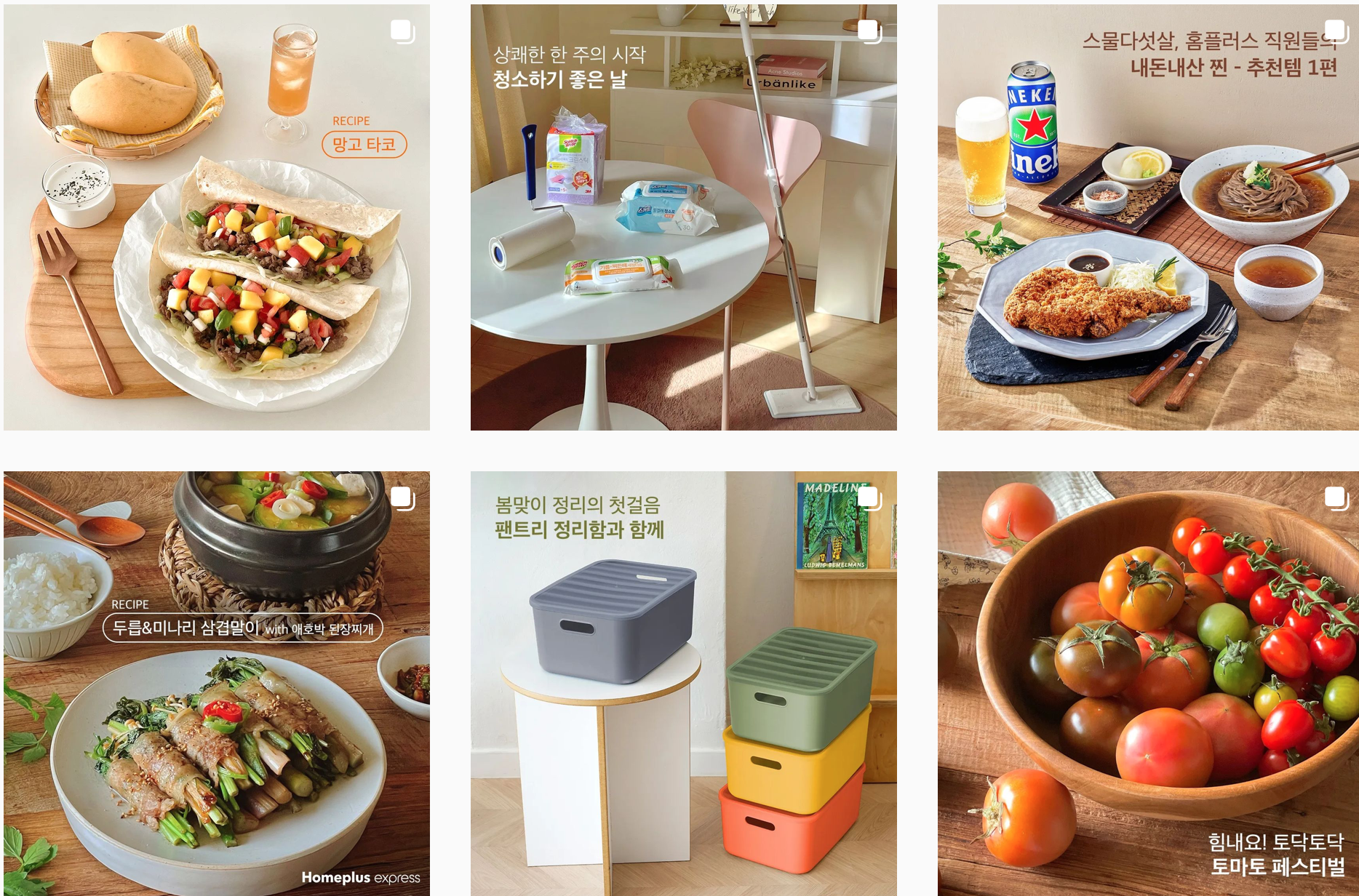홈플러스 인스타그램은 통일성 있는 피드로 29만 팔로워를 보유하고 있는데요. 그날의 신선 식품을 이미지로 업로드하고 있는데, 이런 경우에는 트위터나 페이스북 같은 텍스트 중심의 매체보다 이미지 위주의 매체가 적합하겠죠.