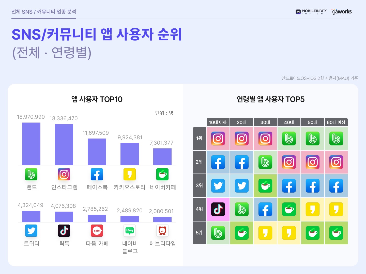 SNS 운영에 대한 목표를 구체적으로 세웠다면, 우리 브랜드의 고객이 어떤 SNS를 주로 사용하는지 파악해야 돼요. 예를 들어 페이스북, 인스타그램, 트위터 등 각 SNS 이용자들의 특성도 다른데요. 아래 이미지를 보면 한국인이 가장 많이 사용한 SNS를 순서대로 확인할 수 있어요. 국내 SNS/커뮤니티 앱 사용자 순위는 네이버 밴드, 인스타그램, 페이스북 순서예요.