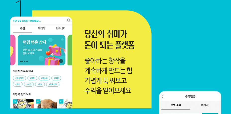 나만의 콘텐츠를 연재할 수 있는 플랫폼을 찾고 계시나요? 영상 콘텐츠라면 유튜브나 비메오가 먼저 떠오르지만, 일러스트나 글은 어디에 업로드해야 할지 잘 모르실 거예요. 그런 분들을 위해 작가로서 정식 데뷔할 수도 있는 플랫폼을 소개해 드릴게요. 바로 온라인 서점 알라딘이 런칭한 '투비컨티뉴드'입니다. 투비컨티뉴드는 사용자가 직접 수익을 얻을 수 있는 유료 게시 기능을 통해 크리에이터의 창작 활동을 지원하고요. 알라딘이 온라인 서점으로서 탄탄히 쌓아온 입지를 통해 크리에이터가 출판의 꿈도 이룰 수 있도록 돕습니다. 본인의 콘텐츠를 어떻게 알려야 할 지 모르는 신입 크리에이터들에게 특히 도움이 될 거예요.