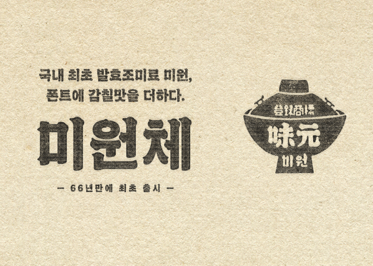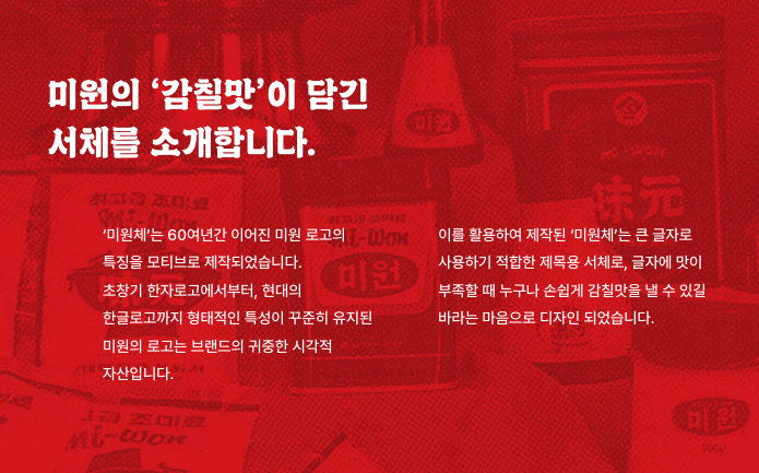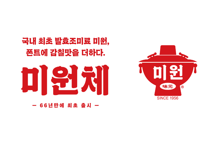 미원은 이번 서체 출시를 통해 조미료 미원이 '66주년'이라는 점을 강조했습니다. 앞서 보았던 롯데리아가 영한 느낌으로 브랜드를 재이미지화하는 것과는 정반대의 모습이라고 볼 수도 있을 것 같아요. 요새는 조미료를 잘 안 쓰는 추세이기도 하고, 특히 젊은 사람은 치킨스톡 같은 외국산 조미료를 더 자주 사용하는 모습도 흔하게 볼 수 있죠. 이런 점에서 미원은 보다 적극적으로 대표적인 한국의 조미료인 미원을 한국의 '감칠맛'으로 브랜딩 하려고 시도했다고 볼 수도 있을 것 같아요. 서체의 스타일부터가 굉장히 한국적인 느낌을 표방하고 있기도 합니다.