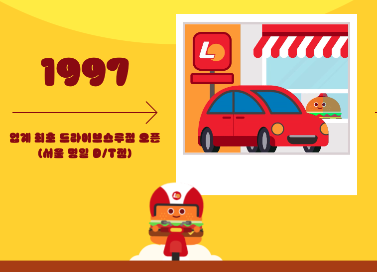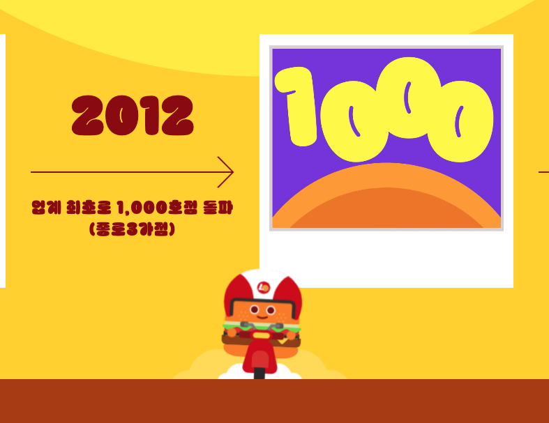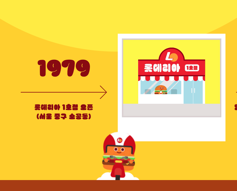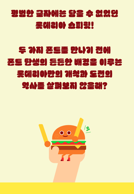 '촵땡겨체'와 '딱붙어체'는 2023 우주교신용 서체라는 컨셉으로 만들어졌는데요. 이게 갑자기 무슨 소리냐고요? 롯데리아폰트 홈페이지에 따르면 이 컨셉은 사실 롯데리아의 '도전정신'이라는 브랜드 방향성을 풀어내기 위해서 만들어진 컨셉이에요. 이를 뒷받침하기 위해서 롯데리아는 귀여운 일러스트를 활용해서 브랜드 사업이력을 만들었는데요.