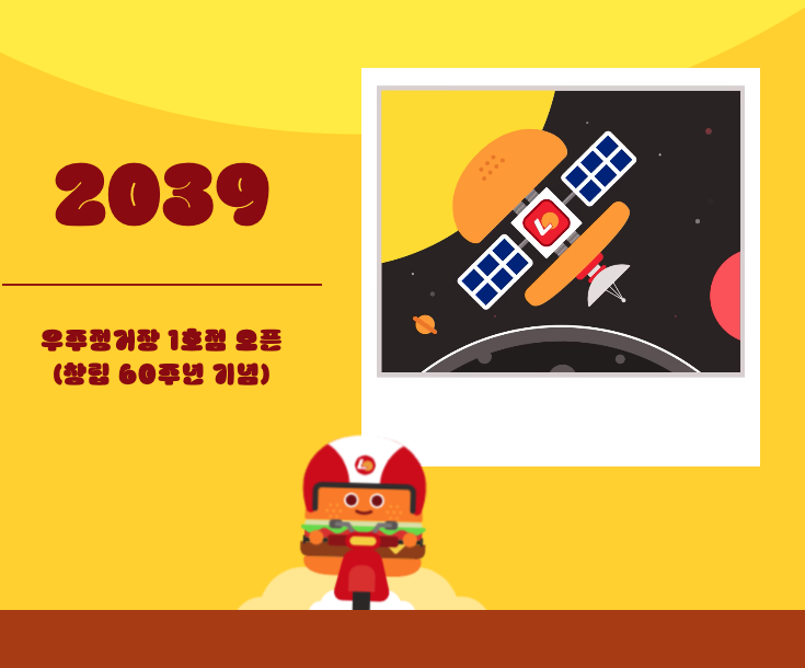1979년 롯데리아의 정식 개점부터, 1977년 최초의 드라이브스루 형태 매장 개점, 1998년 베트남 지점 진출, 불고기버거나 라이스버거 같은 전 국민이 좋아하는 버거를 먼저 출시해 왔다는 이력들을 연대기 형태로 정리해 두었어요. 그렇기 때문에 우주교신용 서체 출시란, 이렇게 도전해 온 롯데리아가 2039년에는 우주점을 최초로 내보겠다는 흥미로운 마케팅적인 선언인 것이죠. 1979년부터의 업력을 자랑하지만, 그럼에도 불구하고 '도전정신'이라는 새로운 프레임을 통해서 더 젊고 개척적인 브랜드라는 느낌이 들어요. 즉 서체는 이렇게 브랜드의 정체성이나 방향성을 압축해서 보여줄 수 있다는 점에서 의미가 있어요.