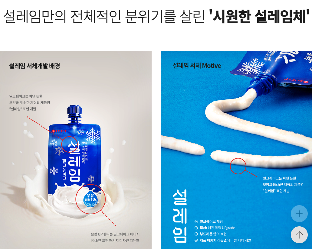 그러면 이와 비슷한 유통기업들의 사례들을 볼까요. 롯데제과는 작년 출시 20주년을 맞아서 아이스크림인 '설레임'의 느낌을 따서 '시원한설레임체'를 출시했어요. 2003년 출시된 설레임을 모르는 사람은 아마도 없을 것 같은데요. 시원한설레임체를 보면, 고운 입자의 얼음 같은 슬러쉬인 설레임의 맛을 서체로 표현해서 글자 자체에 아이스크림의 질감이 느껴지는 것 같기도 해요. 서체만 보아도 아이스크림이 바로 떠오른다니, 엄청난 이미지적인 구현이 아닐까 싶은 사례입니다.