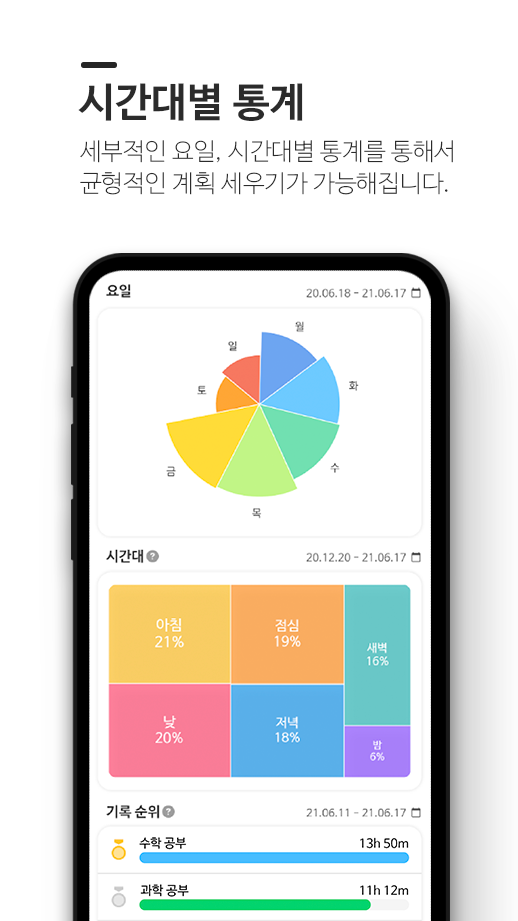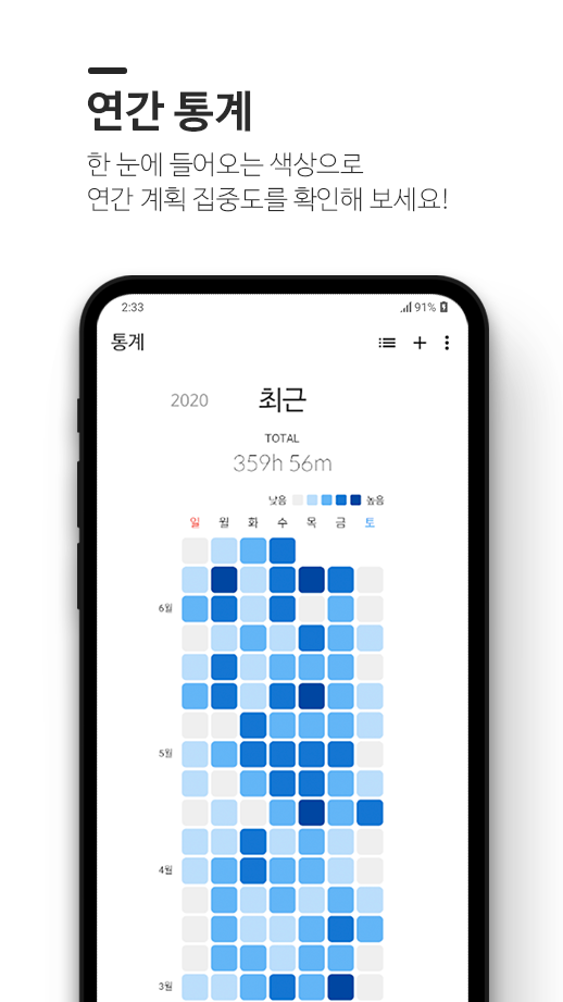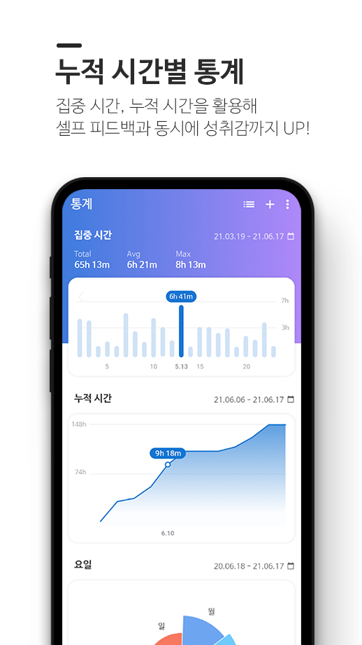 게다가 타이머 기록을 바탕으로 시간별, 일별, 월별 통계를 확인할 수 있어서, 내가 언제 어떤 계획을 수행했는지 확인할 수 있어요. 습관을 형성하려면, 메타인지를 활용해 스스로를 점검하면서 계획을 수정해나가야 한다고 하죠. 해빗 트래커는 이렇게 나에 대해서 분석하고 점검하는 일을 손쉽게 도와줍니다.