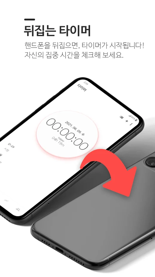 두 번째로 소개할 어플은 '도트 타이머'예요. 도트 타이머의 핵심기능은 핸드폰을 '뒤집어야' 타이머가 실행이 된다는 것입니다. 스마트폰은 일상생활에 큰 도움과 정보를 주기도 하지만, 한편으로 우리가 무언가를 수행하려고 할 때, 가장 방해가 되는 것이 스마트폰이기도 하죠. 도트 타이머는 타이머를 실행하는 시간 동안 핸드폰을 전혀 사용할 수 없기 때문에 방해받지 않는 집중 시간을 만들어줘요.