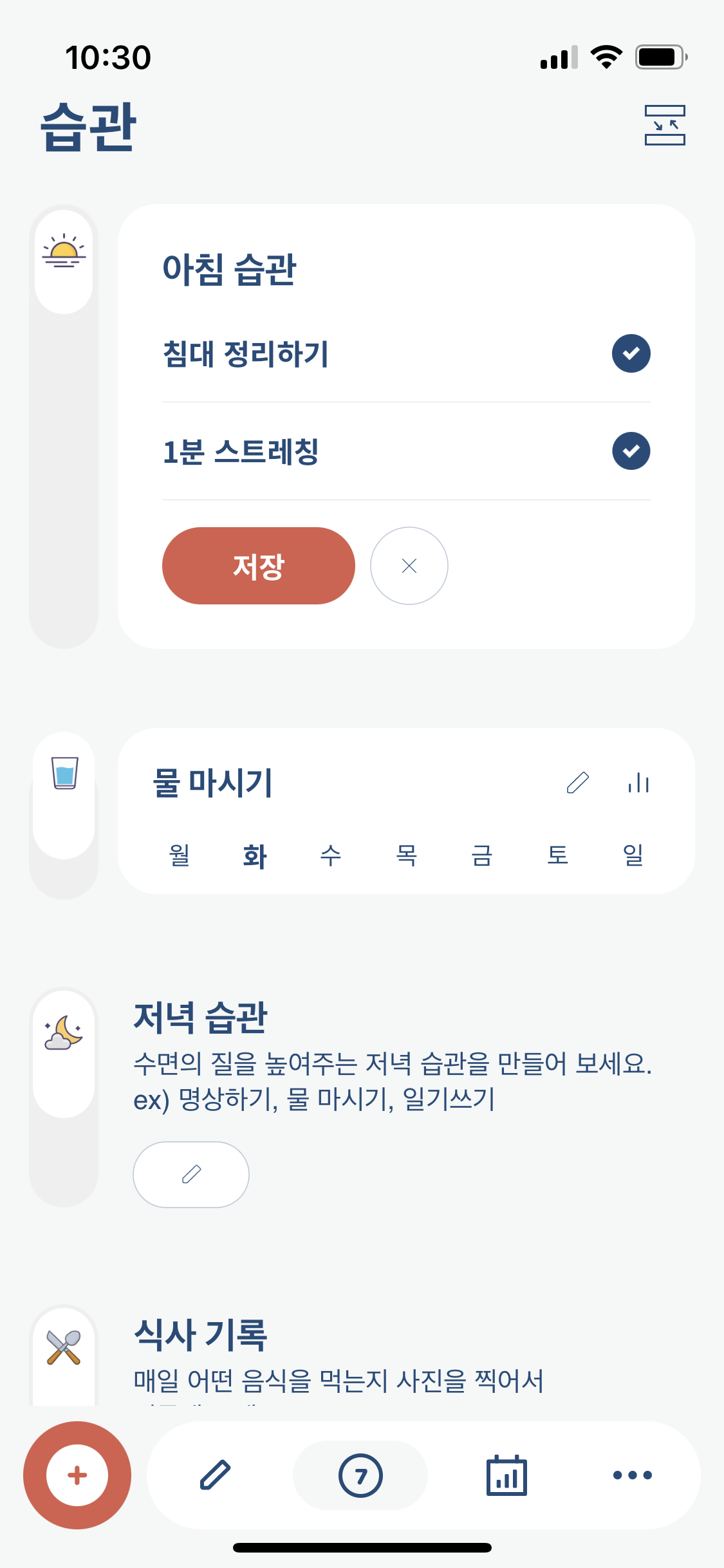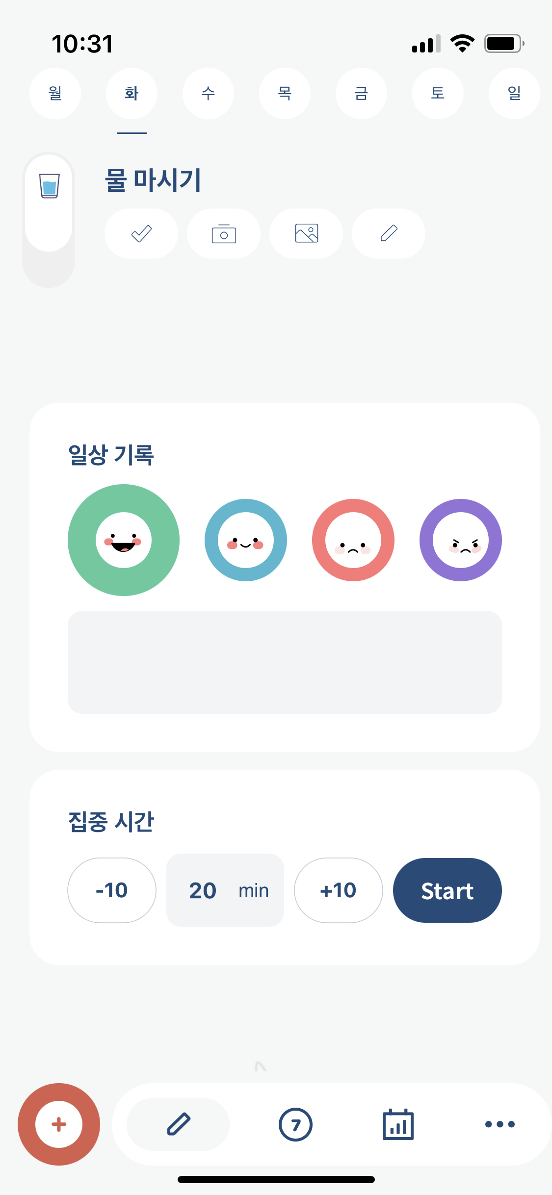 또 그날의 기분을 기록할 수 있어서, 무드트래커 어플을 따로 쓸 필요가 없어요. 위젯 디자인도 심플하고, 오전과 저녁으로 섹션이 구분되어 있어서 직관적이에요. 새해에 목표로 한 것들을 하루 단위로 세분화해서 해빗트래커에 입력해 보면 어떨까요?