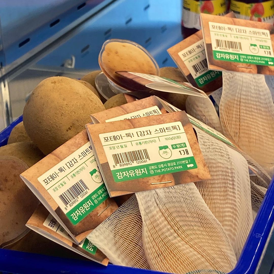 그로서리 스토러와 로컬 스토어가 있는 1층에는 귀여운 굿즈도 판매해요. 귀여운 감자 모양을 본뜬 그립톡이에요. 아보카도, 체리, 딸기 등 다양한 굿즈로 생산되었던 귀여운 과일/채소들이 있었는데 감자를 이렇게 만나니 상당히 이색적입니다. '감자' 라는 한 우물만 판 사람만이 생각할 수 있는 독특한 결과물 아닐까 싶어요. 그 외에도 찐 감자에 누룩을 넣어 발효시킨 감자술도 판매하고 있어요. 병당 5,500원의 저렴한 가격으로 청주보다 훨씬 부드럽고 화이트와인 스타일의 향을 느낄 수 있어요.
