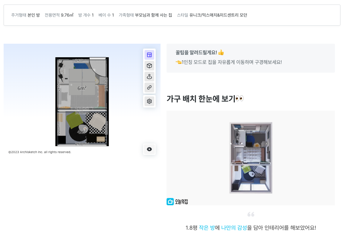 두 번째로 오늘의집 하면 빼놓을 수 없는 기능이 바로 '3D 인테리어'이죠. 이전에는 이사나 독립을 준비하면서, 이사일정을 앞두고 가구 배치에 대한 고민을 추상적으로 밖에 할 수 없었는데요. 요즘에는 미리 이사 갈 집의 평수를 재두기만 하면 오늘의집의 '3D 인테리어' 기능을 활용해서 오늘의집에서 판매하는 모든 가구들을 직접 3D로 설치를 해볼 수 있기 때문에 이사를 준비하는 대부분의 사람들이 이를 활용하고 있죠. 그리고 여기서 오늘의집이 정말 '공유'를 중시한다는 점이 두드러지는데요. 이 3D 기능에 '내 프로젝트'라는 이름을 붙여서 3D 도면을 다른 유저들과 공유할 수 있도록 했어요.