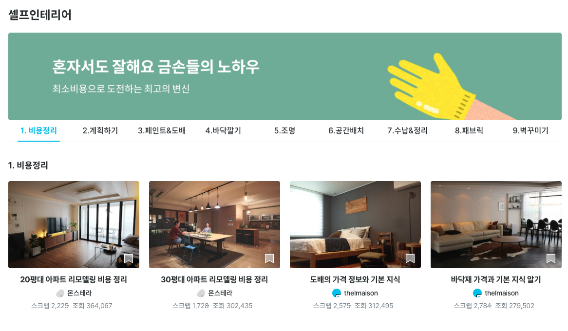 이제 오늘의 집에서는 '셀프인테리어' 탭을 별도로 만들어서, 공사 과정을 정리해 둔 사람들의 포스팅들을 단계별로 나누었는데요. 실제로 셀프인테리어를 고민하고 있는 사람들은 필요한 정보를 쉽게 찾을 수 있게 되었어요.