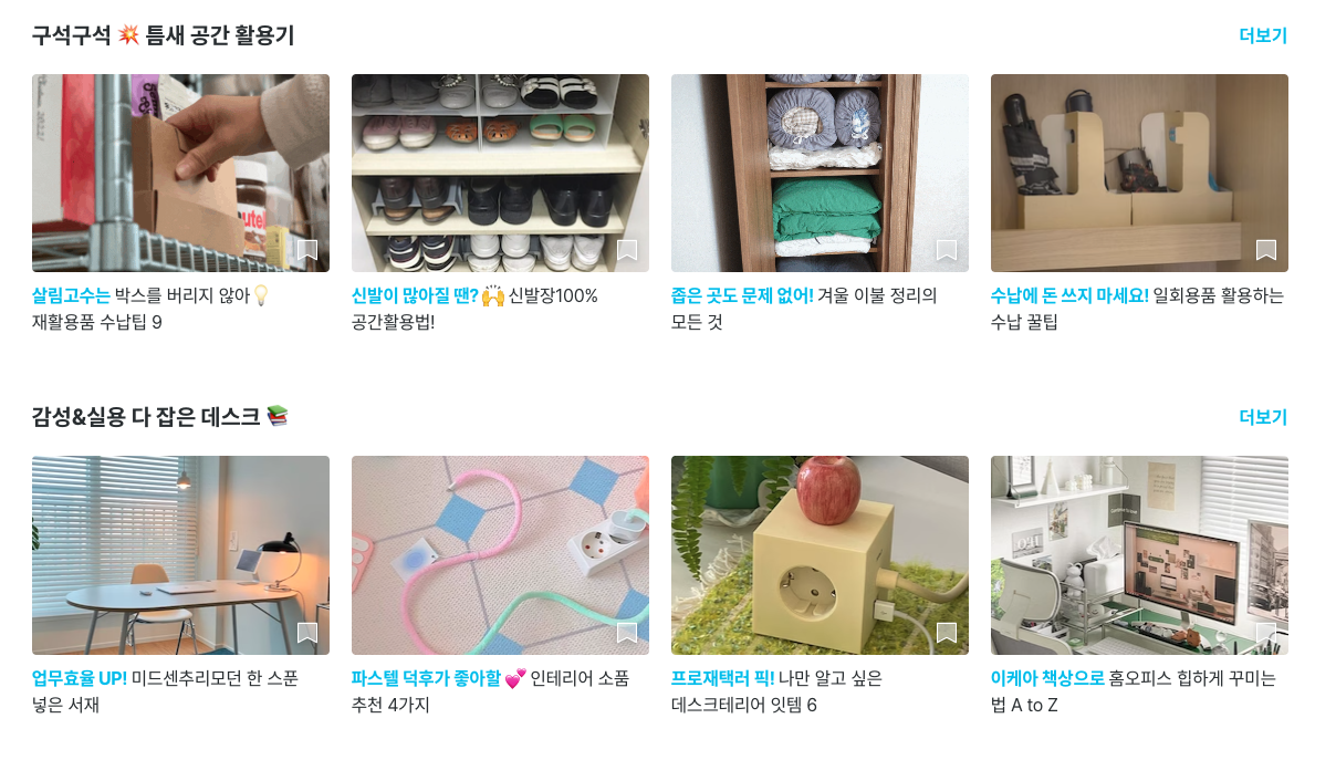 오늘의집의 또 다른 중요한 테마는 바로 '실용성'이기도 해요. 아마 오늘의집을 이용하는 2030 세대 가구의 대부분이 1인가구일 텐데요. 막 독립을 시작한 사회초년생이거나 신혼부부인 경우 자잘한 수납부터 가구 배치, 청소방법이나 쉬운 루틴 등등 새롭게 알아야 하는 정보가 많죠. '노하우'는 이런 팁들을 주제로 탭이 꾸며집니다.
