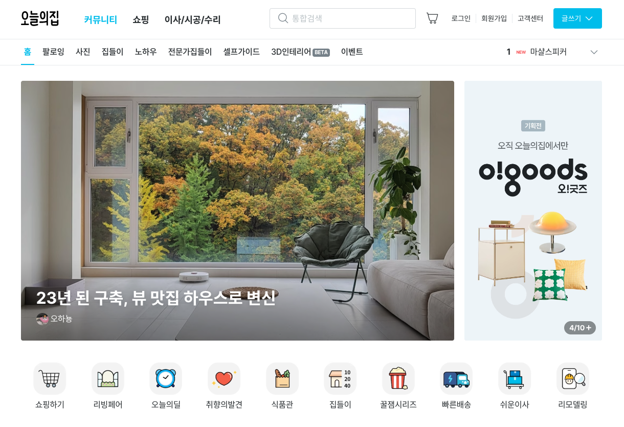 라이프스타일 서비스인 '오늘의집'에 올라오는 사진들을 보면, 아무리 작은 원룸이라 할지라도 집은 결국 개인의 취향을 반영한 공간 같아요. 다양한 인증사진을 보다 보면, 작은 원룸도 얼마든지 나의 취향을 반영해서 꾸밀 수 있다는 생각이 들게 되죠. 이런 점에서 오늘의집의 홈페이지는 가구나 인테리어 소품을 판매하는 플랫폼이라기보다는, 순전히 인테리어에 관한 블로그나 생활 꿀팁을 알려주는 사이트처럼 보이기도 해요. 실제로 오늘의집 홈페이지의 상위 카테고리 중에서 가장 앞에 있는 탭이 '커뮤니티'이기도 하고요. 여기서 온라인집들이를 할 수도 있고, 수납, 리폼, 시공, 청소 등등에 대한 노하우를 전달받을 수도 있어요.