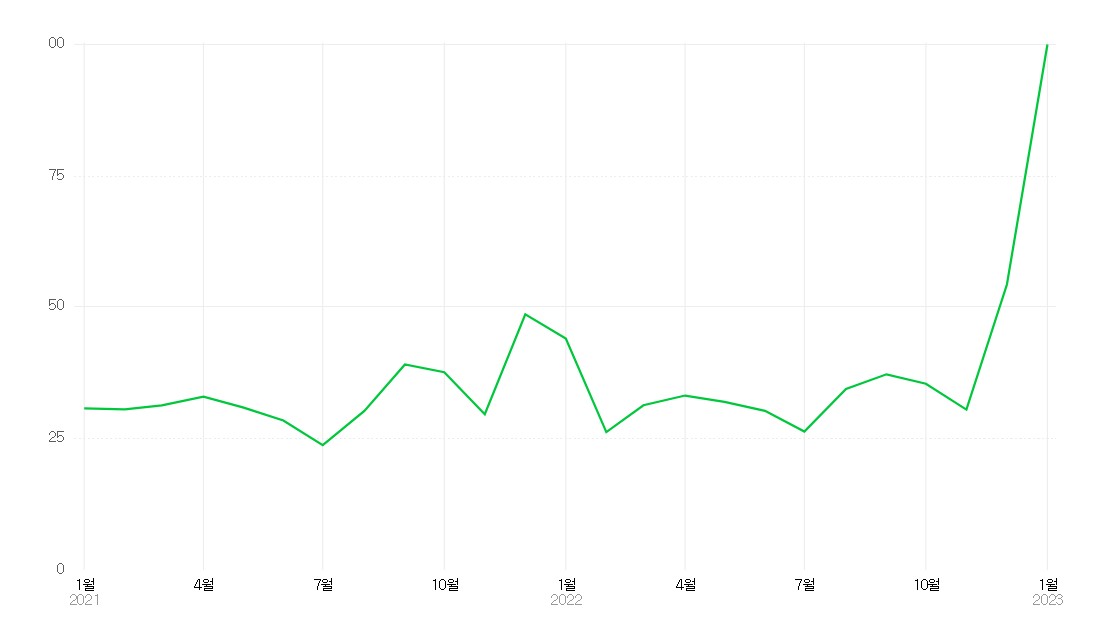 스타벅스 경동시장 1960점 또한 지역 사회와의 상생을 잊지 않았어요. 실제로 매장에서 판매하는 모든 제품마다 300원씩 경동시장 지역상생 기금으로 조성돼요. 또한 스타벅스가 있는 경동시장 자체가 핫플레이스가 되었어요. 스타벅스가 오픈한 2022년 12월 이후 ‘경동시장’의 키워드 검색량이 아래와 같이 급격하게 늘어났거든요.