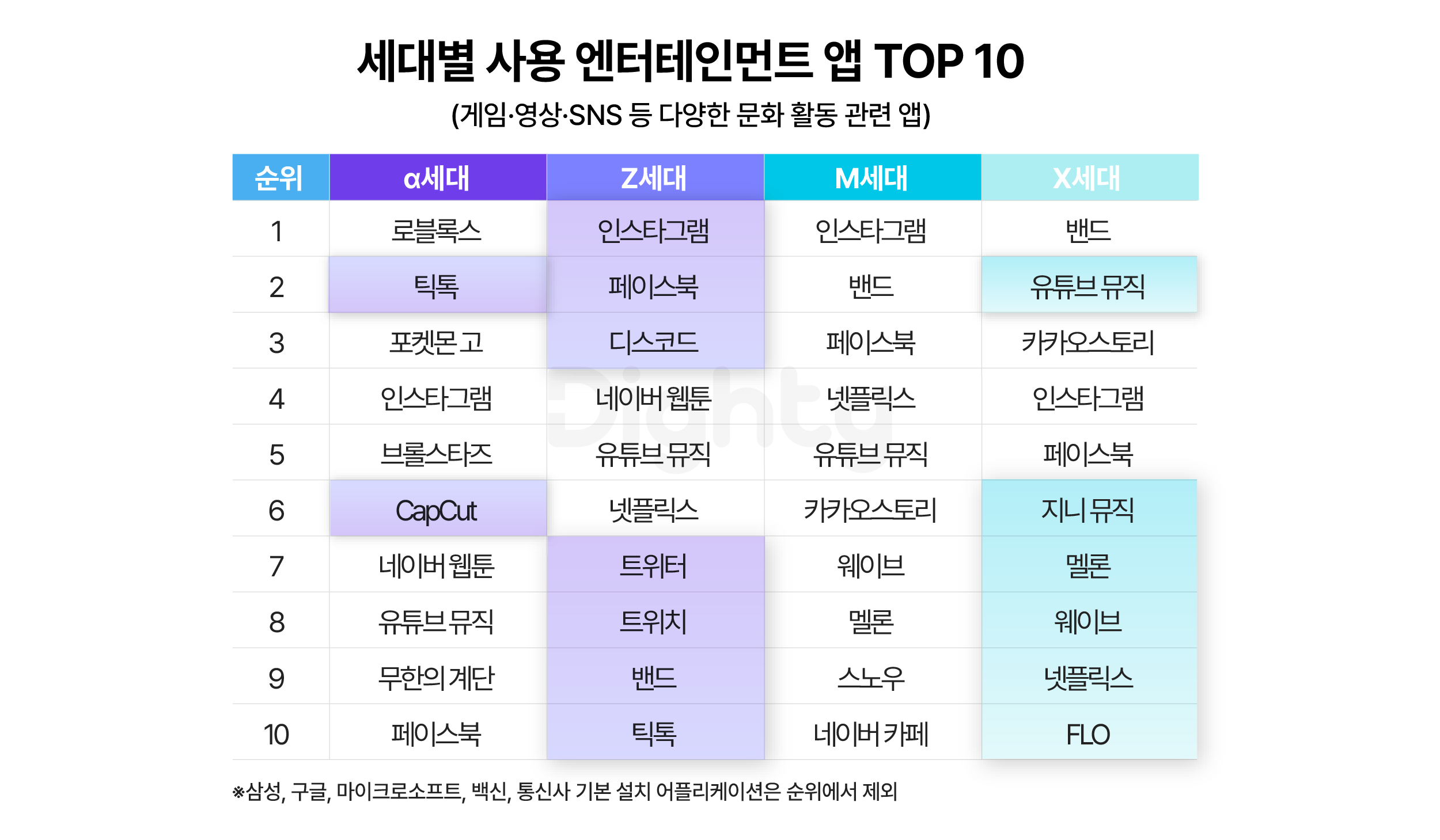 먼저 밀레니얼 세대는 배달의민족, 네이버지도 내비게이션, 쿠팡 등 생활 밀착형 어플들을 많이 사용해요. 그에 반해 Z세대는 주로 게임에 사용하는 음성 채팅 프로그램인 디스코드나 네이버웹툰, 넷플릭스, 유튜브 뮤직처럼 엔터테인먼트와 여가 위주예요. 개인의 '취향'을 바탕으로 한 여가나 소비를 중시하는 Z세대의 특징을 반영합니다. 반대로 알파세대는 10대 답게 주로 로블록스, 무한의 계단, 브롤스타즈 등 게임 앱들이 전반적으로 많지만 CapCut 같은 비디오 에디팅 프로그램도 눈에 띄어요. 콘텐츠 소비만큼이나 생산에 익숙하기 때문이죠.