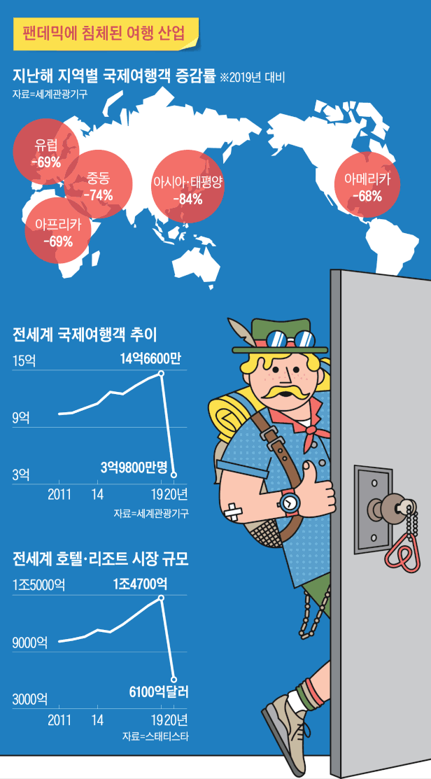 체스키의 우려대로 2020년 전 세계 호텔과 리조트의 매출은 6,100억 달러로 전년도(1조 4,700억 달러)에 비해 반이나 감소했어요. 14억 6,600만 명이 넘던 국제 여행객이 4억 명으로 수직 낙하하기도 했고요.