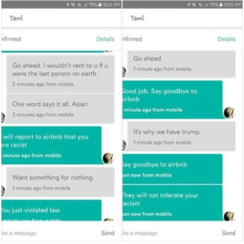 지난 반세기 동안 시민권 운동의 일환으로 호텔에서의 차별에 대해 보호받을 권리를 얻었는데, 에어비앤비가 이를 무너트리고 있는 거나 다름없다는 의견도 있고요. 에어비앤비 측은 이를 위해 여러 정책을 동원해 호스트들에게 계약상 차별금지 조항에 서명하게 하고 있으나, 지속적인 문제가 발생하고 있다는 점에서 관리가 되지 않는다는 평가를 받고 있어요.