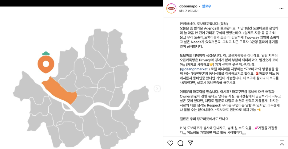 뿐만 아니라 최근에는 당근마켓을 이용한 도보마포 채팅방이 개설되었어요. 큐레이션은 일방향적인 정보 전달이었기 때문에, 도프라인, 도보마포 채팅방과 같이 쌍방향으로 소통하는 창구를 지속적으로 늘리려고 노력하시는 것 같아요.
