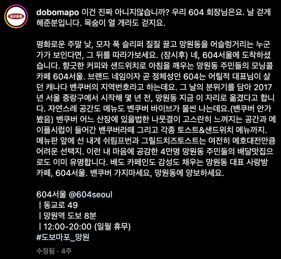 인스타그램 소개글에서도 알 수 있듯이, 도보마포는 마포구 토박이가 운영하고 있는 마포구에 대한 모든 것을 소개하는 계정이에요. 맛집, 카페부터 책방, 문구점, 편집샵까지 운영자가 모두 직접 발로, 도보로 다니며 발굴해 낸 곳을 올리고 있어요.