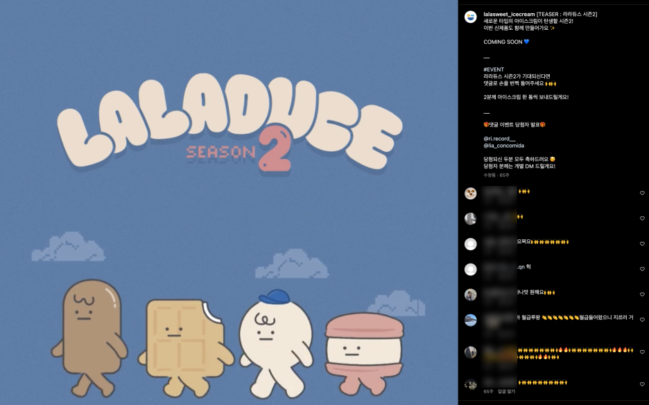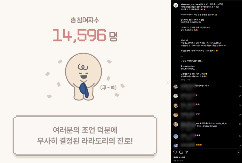 이후에도 모나카의 맛과 패키지 중에 더 집중해야할 부분에 대해서도 투표를 거치는 등 소비자들의 참여와 소통을 지속적으로 끌어냈어요. 이렇게 함으로써 소비자들의 수요를 직접적으로 반영하는 것 뿐만 아니라, 하나의 제품이 출시되기까지의 과정을 소비자들이 쭉 지켜보면서 저절로 관심과 애정을 가질 수 있었어요. 소비자들을 자연스럽게 라라스윗의 팬으로 만드는 것이죠. 마치 프로듀스101에서 나의 '최애'의 성장과정을 지켜보면서 팬심을 키우게 되는 것처럼 말이에요.