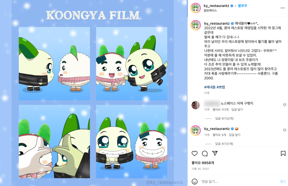 양파쿵야는 2000년대 초반 만들어졌기 때문에, 사람들이 '추억의 캐릭터'로 인식하고 있었는데요. <쿵야 레스토랑즈> 콘텐츠들은 현대에 맞게 각색할 부분은 과감히 수정하고, 그림체와 분위기에는 2000년대 초반의 감성을 그대로 담아냈어요. 2000년대를 뜻하는 'Y2K' 열풍을 잘 사용하여 사람들에게 익숙하게 다가가고 향수를 불러일으켜 더 큰 호응을 얻을 수 있었죠. 인스타툰에서 쓰는 멘션, 태그, 대댓글들도 '그때 그 시절' 말투로 쓰이는데, 사람들 역시 댓글로 그 시절 유행했던 말투로 댓글을 남기며 소통하고 있어요.