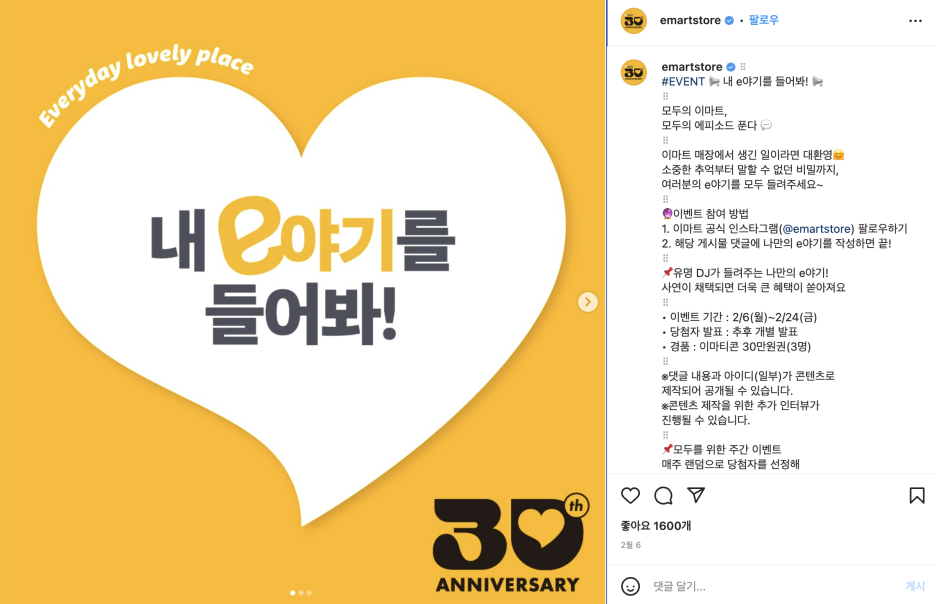 지난 2월에는 SNS이벤트 '내 e야기를 들어봐!'를 통해 사람들이 이마트 매장에서 있었던 추억을 공유하는 이벤트를 진행했어요. 30주년을 맞아 이마트가 진행한 성공적인 캠페인 사례, 잘 보셨나요? 앞으로 이마트가 전개할 마케팅 전략도 기대가 되네요.