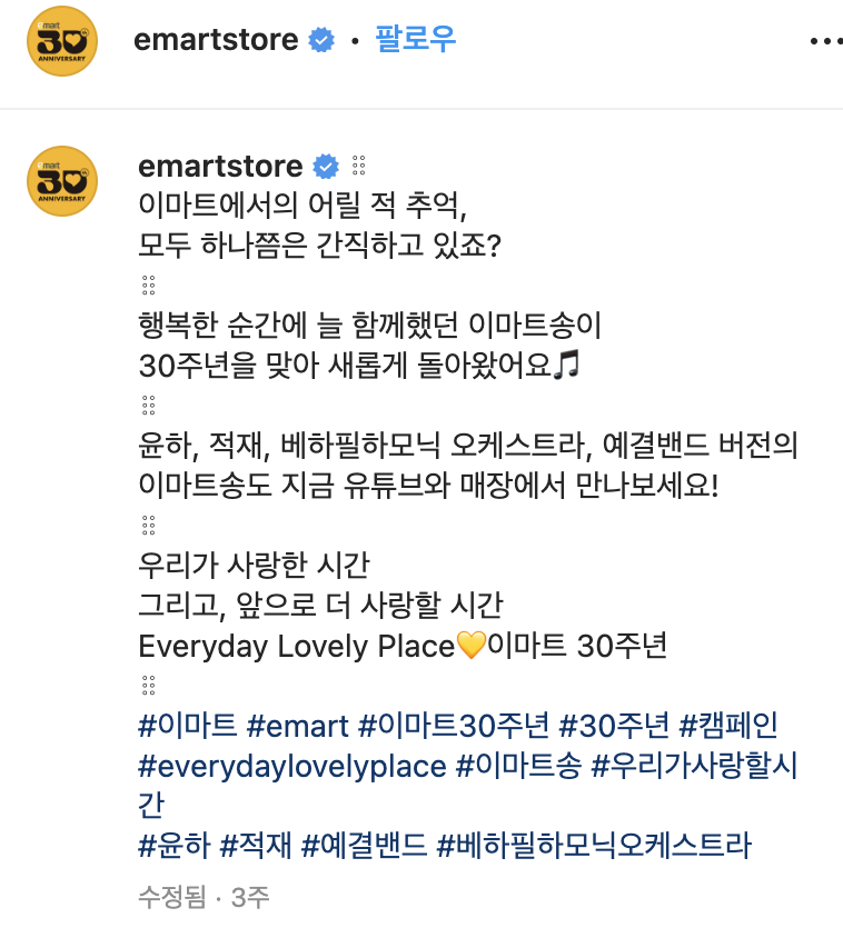 ✔️ 이마트는 30주년을 맞이해서 기존 로고송을 활용한 캠페인과 이벤트를 전개했어요.