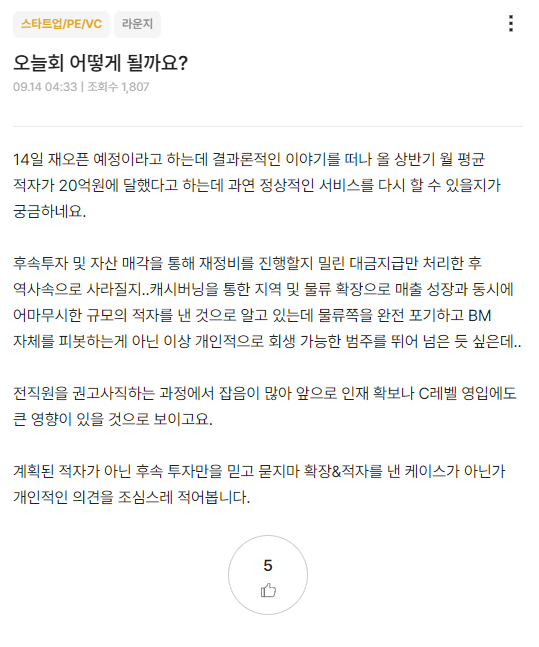 직장인 스카우트 앱 리멤버의 커뮤니티에서는 오늘회 운영이 재개된 14일, 오늘회가 어떻게 될지 미래를 묻는 게시글이 올라오기도 했는데요. 대부분은 정상적인 서비스가 가능할 지에 대해 부정적인 의견을 내비쳤어요. 소비시장의 위축, 후속 투자의 어려움, 전문성의 부족, 지속적인 적자 등을 근거로 들며 회생이 불가능할 것으로 보고 있다고.